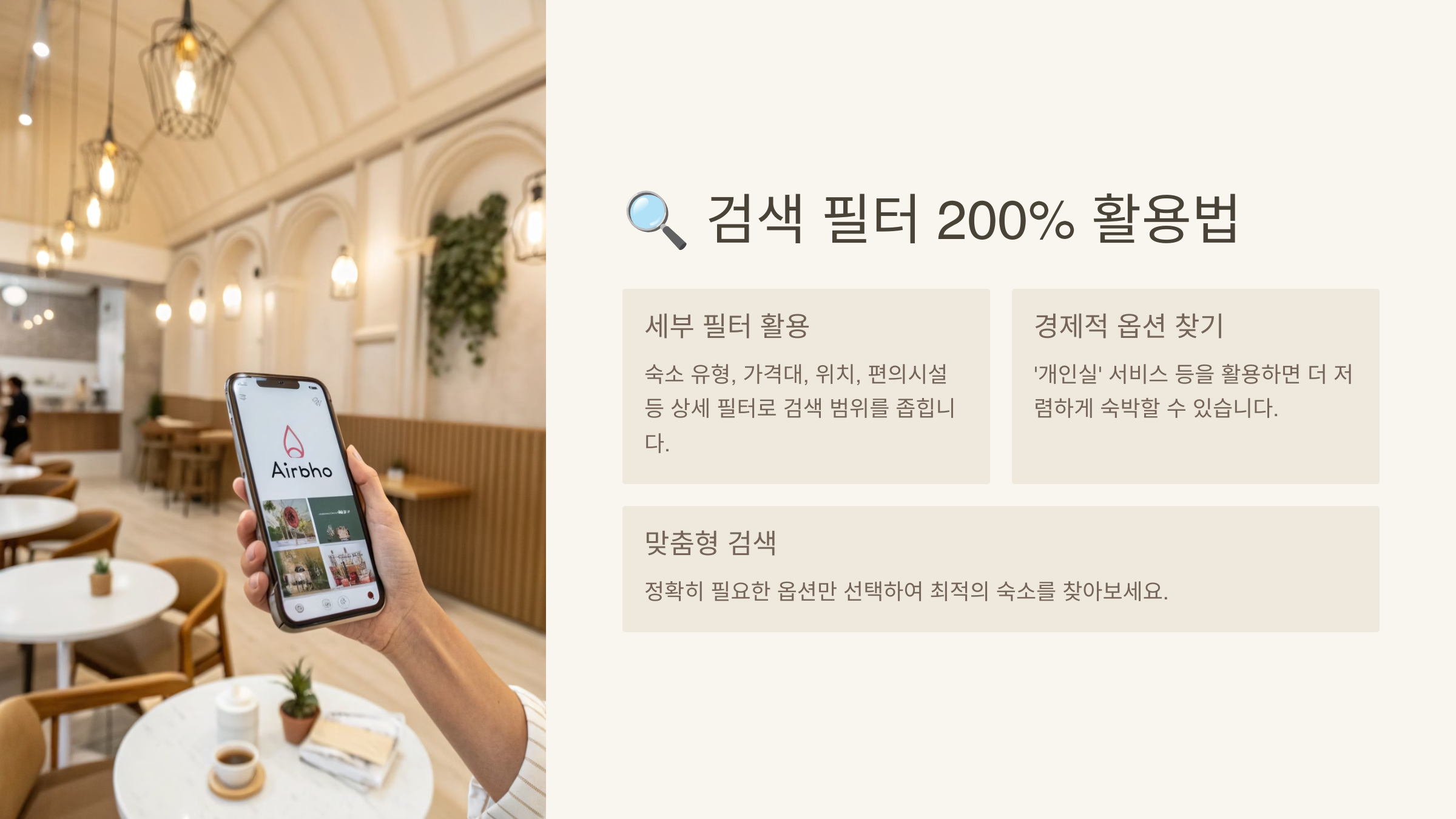 에어비앤비에는 수많은 숙소가 등록되어 있습니다. 이 중에서 내가 원하는 조건의 숙소만 효율적으로 찾아내려면 **검색 필터 기능을 최대한 활용**해야 합니다. 귀찮다고 그냥 넘기지 마세요! 필터만 잘 써도 시간 낭비를 크게 줄이고 만족스러운 숙소를 찾을 확률이 훨씬 높아집니다.
