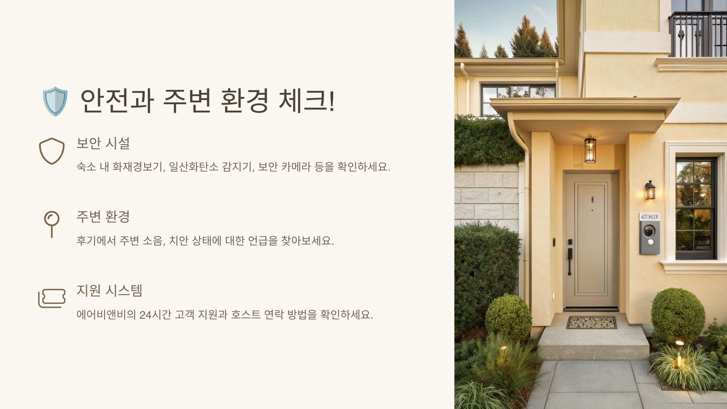 낯선 곳에서의 하룻밤, 무엇보다 안전이 중요합니다. 에어비앤비 숙소를 예약할 때는 숙소 자체의 안전 시설뿐만 아니라 주변 환경까지 고려하여 신중하게 선택해야 합니다.
