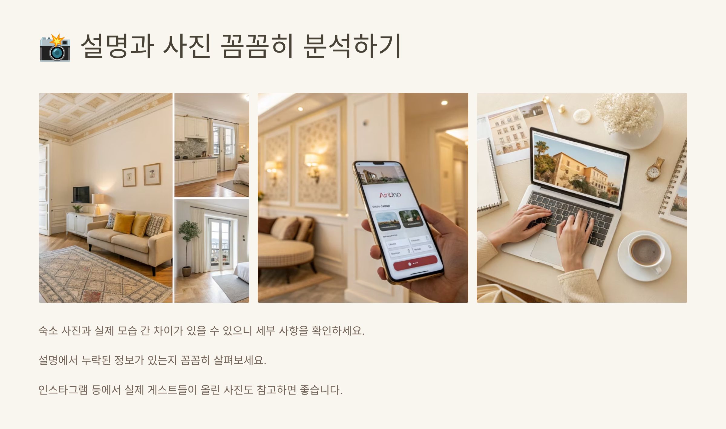 마음에 드는 숙소를 몇 개 추렸다면, 이제 각 숙소의 상세 페이지를 **매의 눈**으로 꼼꼼하게 살펴볼 차례입니다. 특히 사진과 상세 설명은 숙소의 실제 모습을 파악하는 데 중요한 단서가 됩니다.
