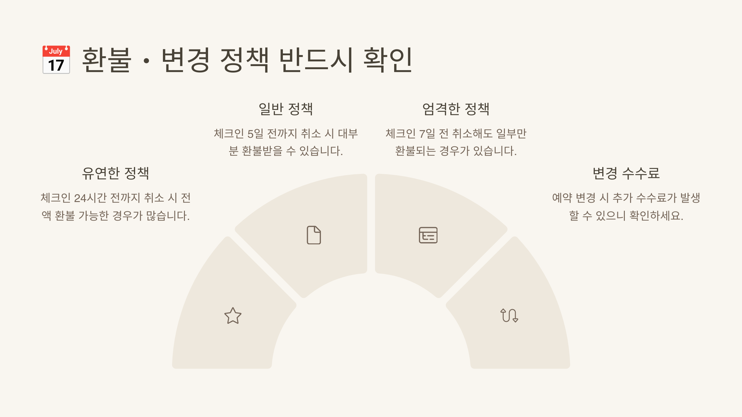 - 저렴한 요금의 함정: 간혹 매우 저렴한 요금의 숙소는 '엄격' 또는 '환불 불가' 정책인 경우가 있습니다. 가격만 보고 섣불리 예약하기 전에 환불 조건을 반드시 확인해야 합니다.
