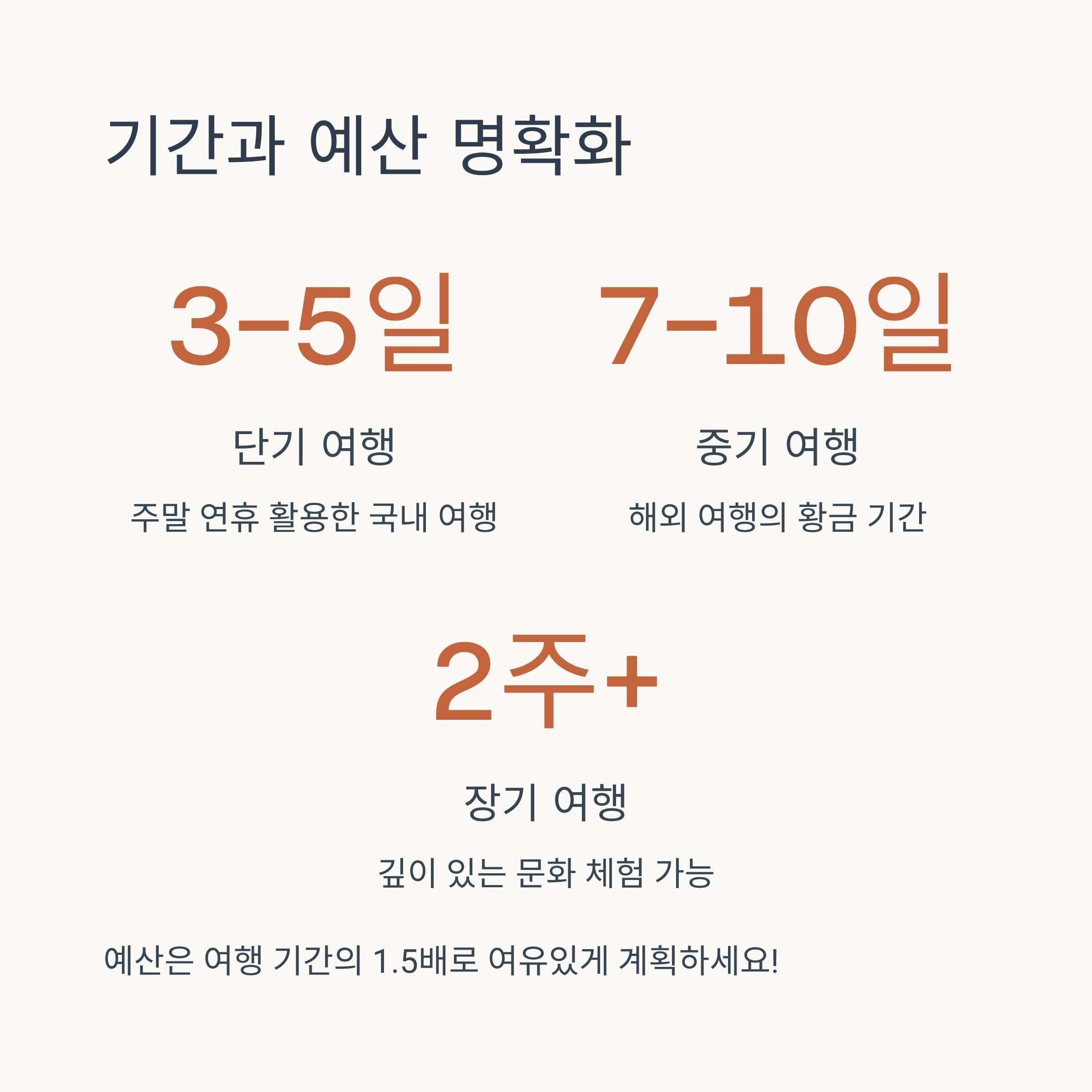 - 기간: '며칠 밤 며칠 낮'으로 명확히 정하고, 이동 시간을 포함하여 실제 관광 가능한 시간을 계산합니다.