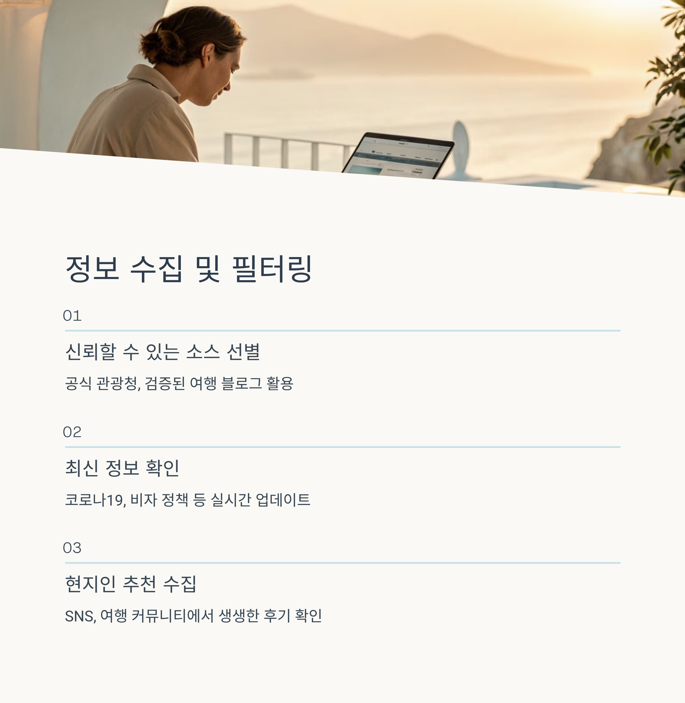 - 필터링: 개인의 목표와 예산, 여행 스타일에 맞는 정보만 취합하고, 너무 오래된 정보는 제외합니다.