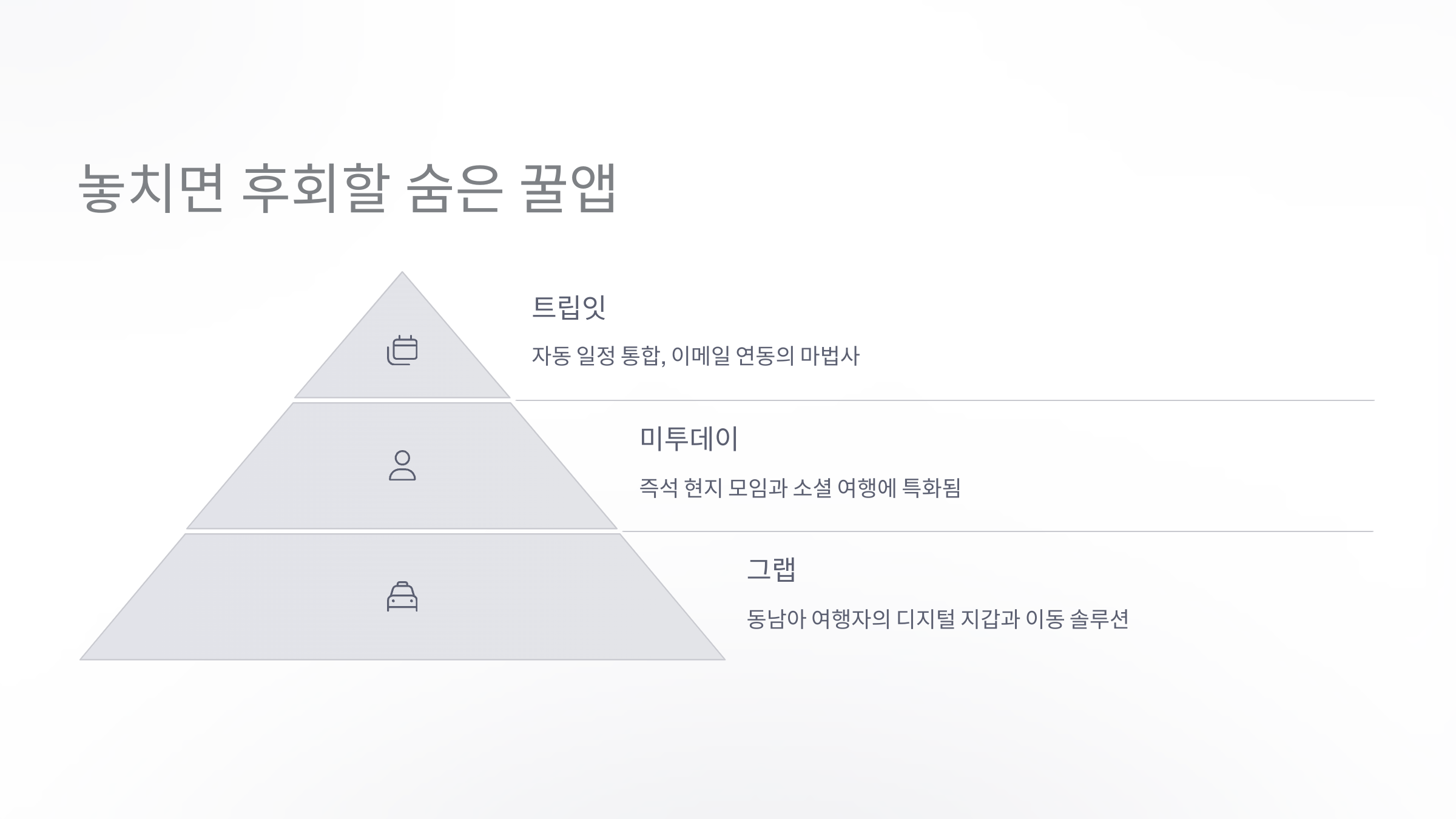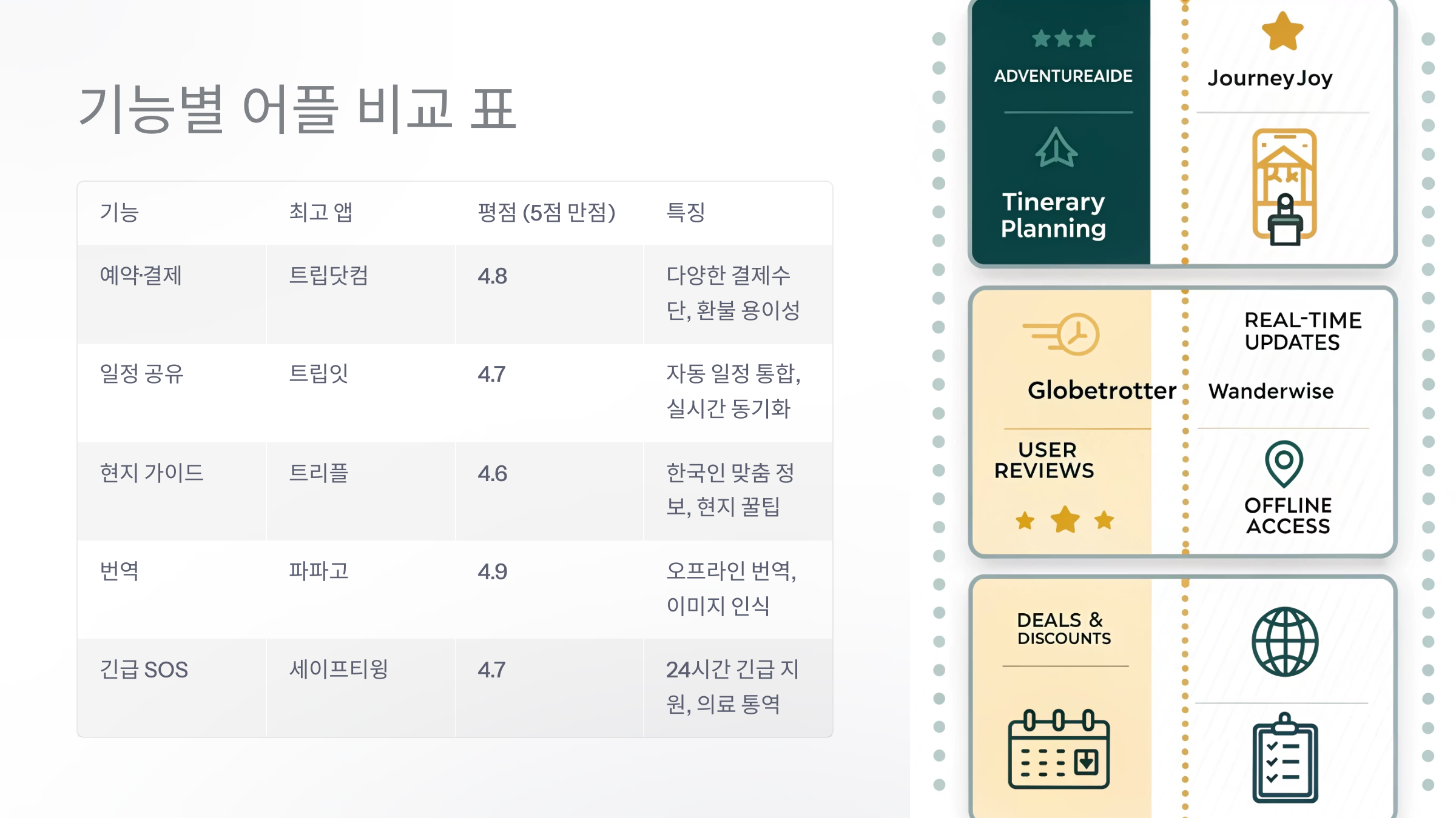 | 여행 스타일 | 자유/가족/혼행/단체에 따라 다른 앱 필요 |