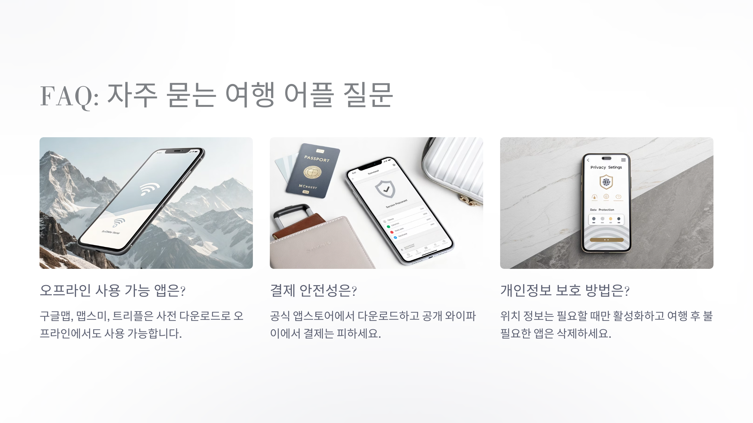 A1. 기능별로 3~5개면 충분해요. 일정, 예약, 지도, 번역, 환율 계산 정도만 있으면 대부분의 상황에 대응 가능해요.