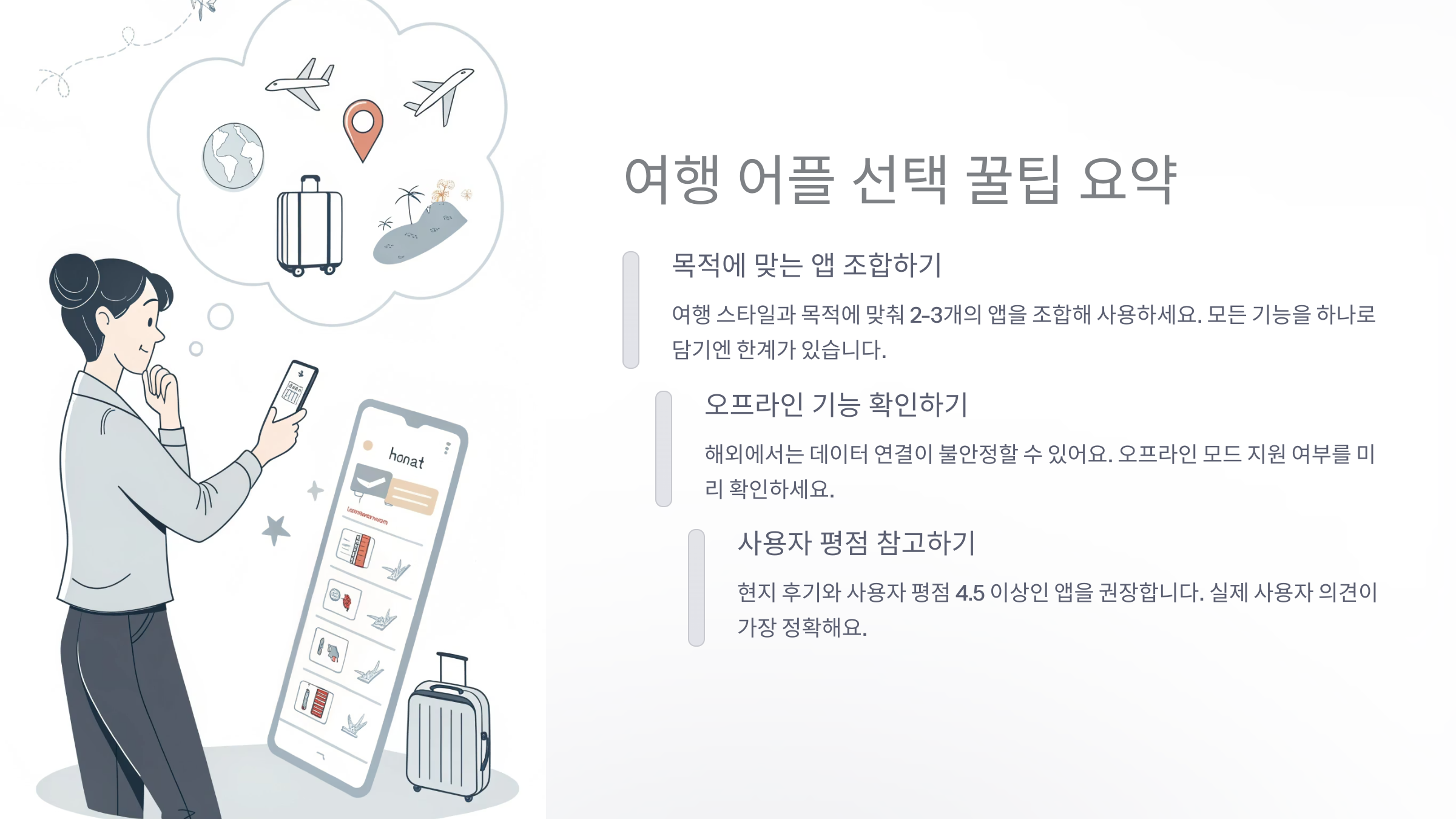 지금까지 다양한 여행 어플을 살펴봤는데요, 이제 마지막으로 어플 선택 시 꼭 기억해야 할 핵심 팁을 정리해볼게요! 단순히 '유명하다'는 이유로 설치하면 후회할 수 있어요.