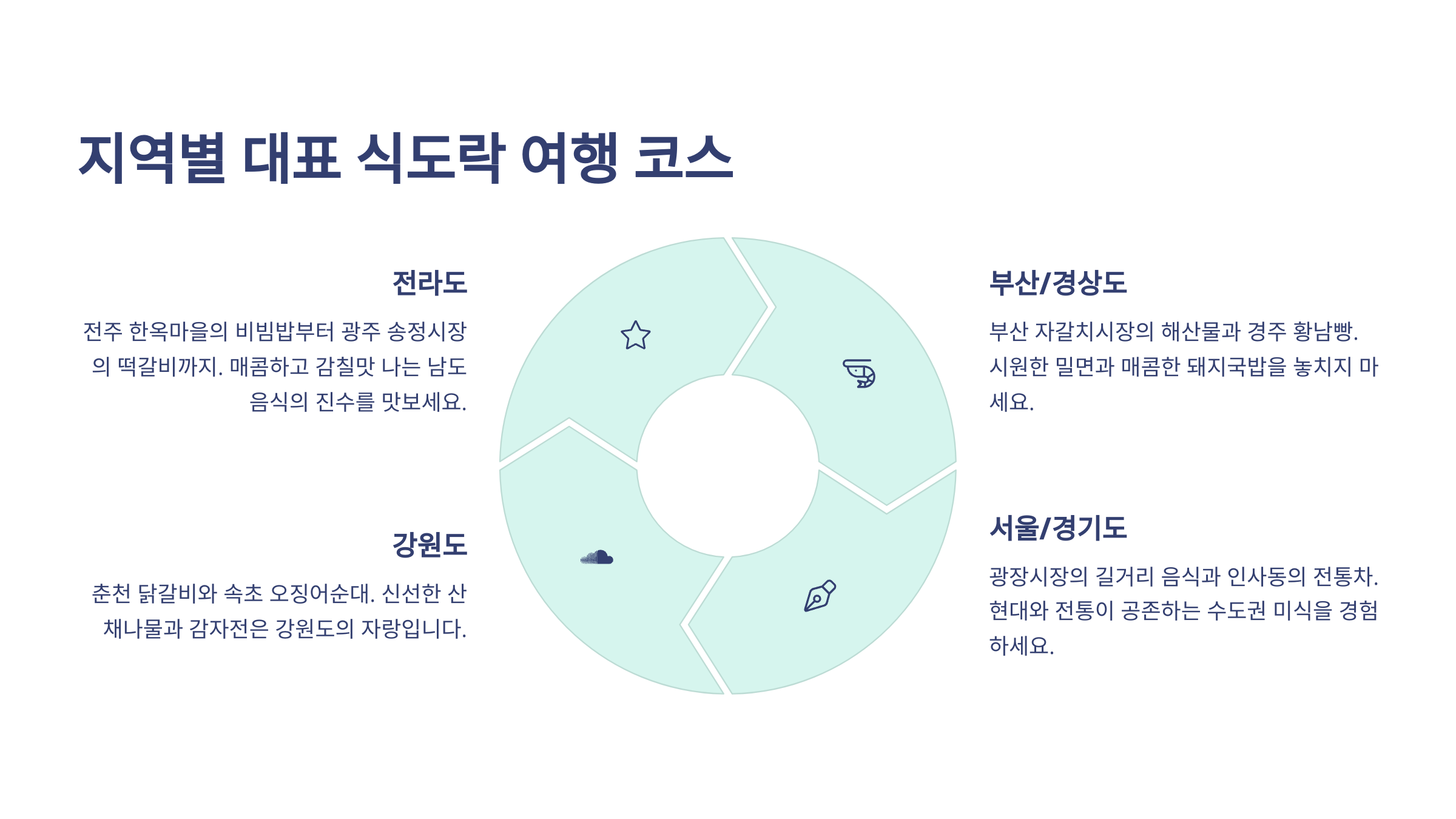 - 식도락 코스는 여행의 동선에 활력을 더해주고, 새로운 경험을 선사합니다.