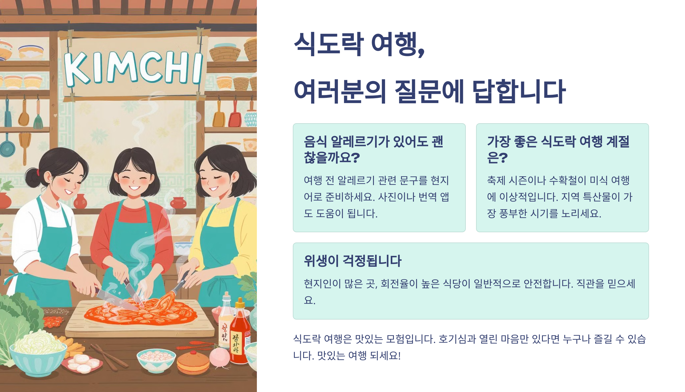 A. 봄·가을은 지역 축제와 신선한 제철 재료가 풍부해 식도락 여행에 최적입니다. 여름엔 해산물, 겨울엔 따뜻한 국물 요리가 인기입니다.