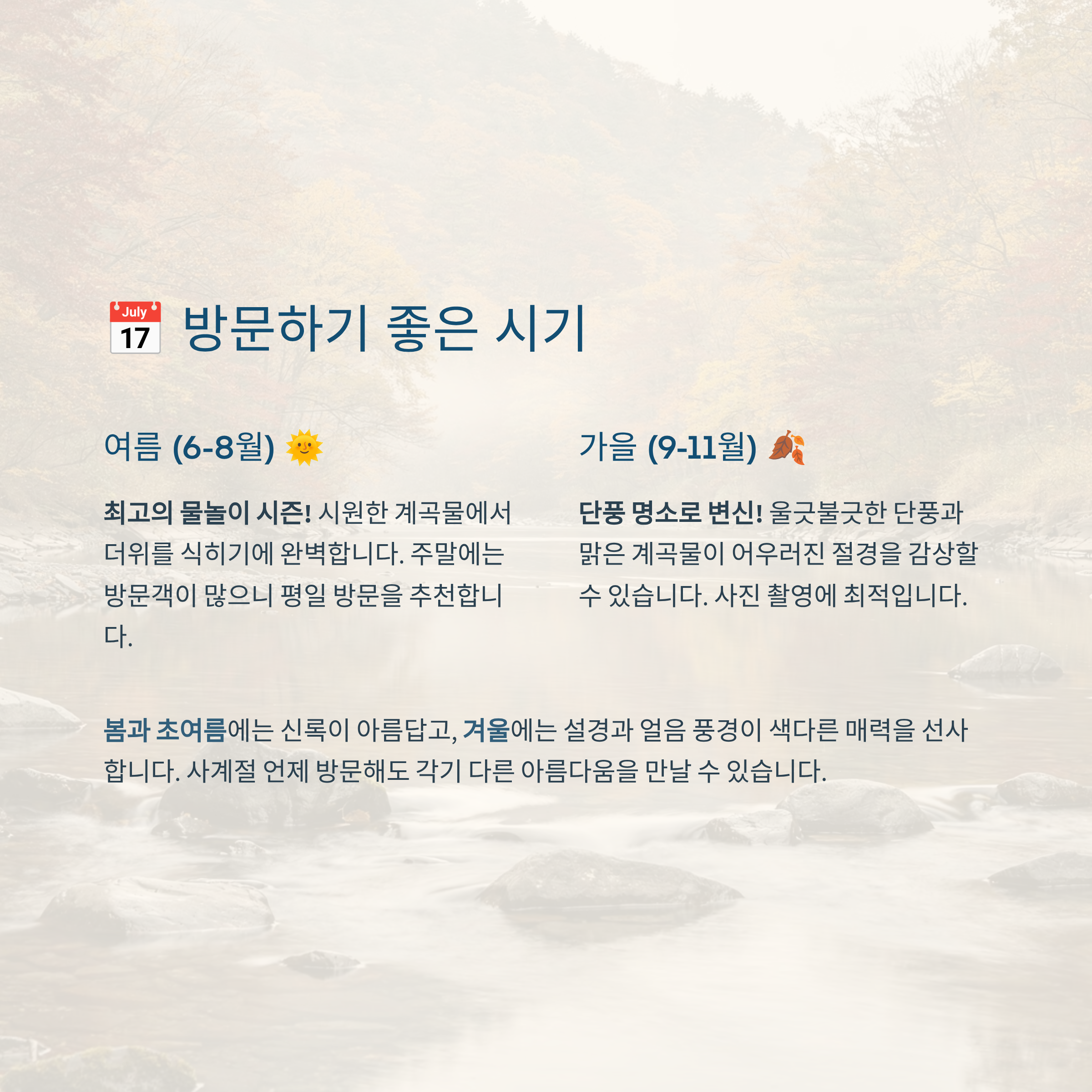• 사계절의 매력: 여름에는 시원한 물놀이, 가을에는 화려한 단풍, 겨울에는 설경, 봄에는 푸릇한 생명력으로 사계절 내내 방문하기 좋습니다.