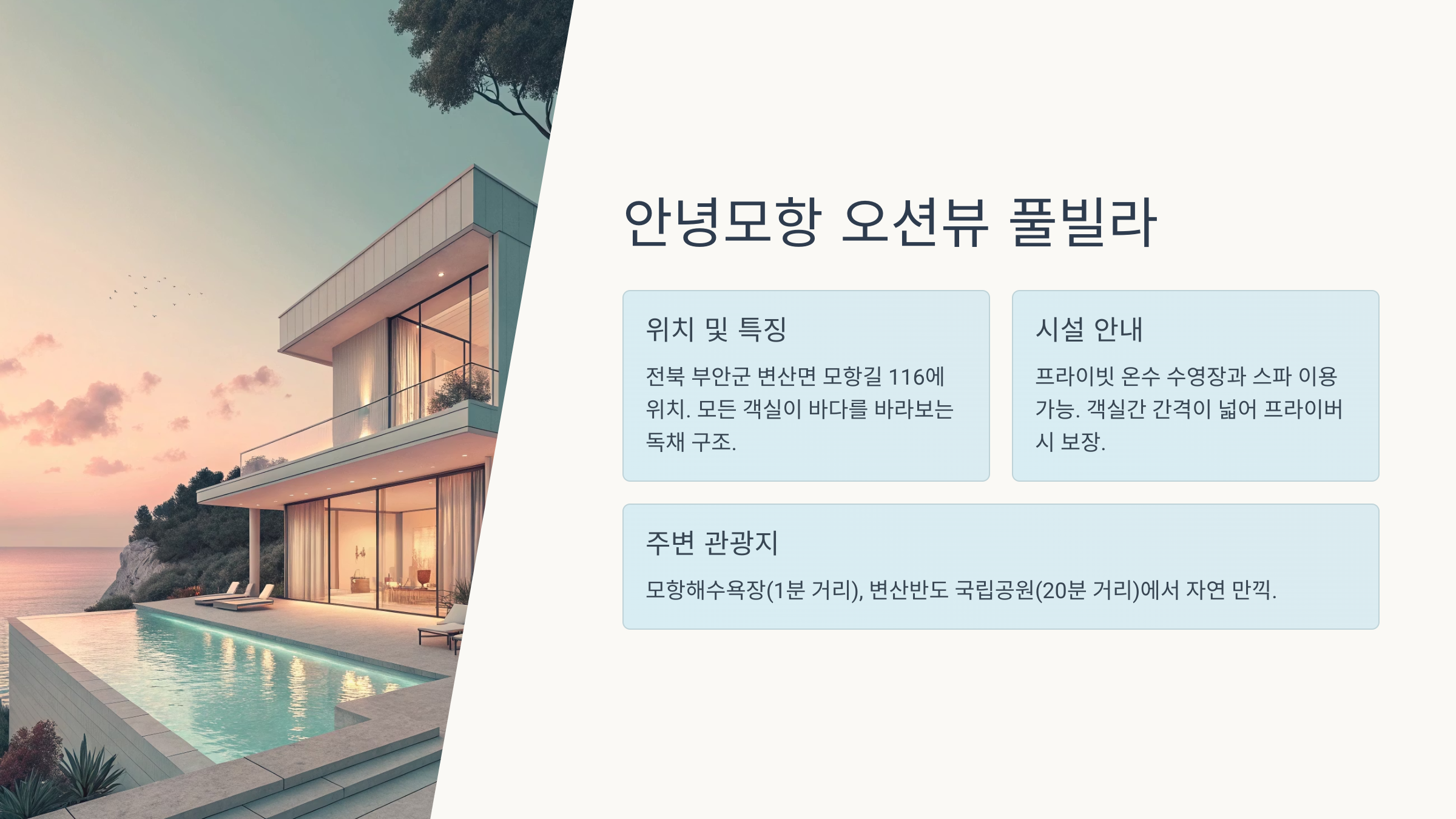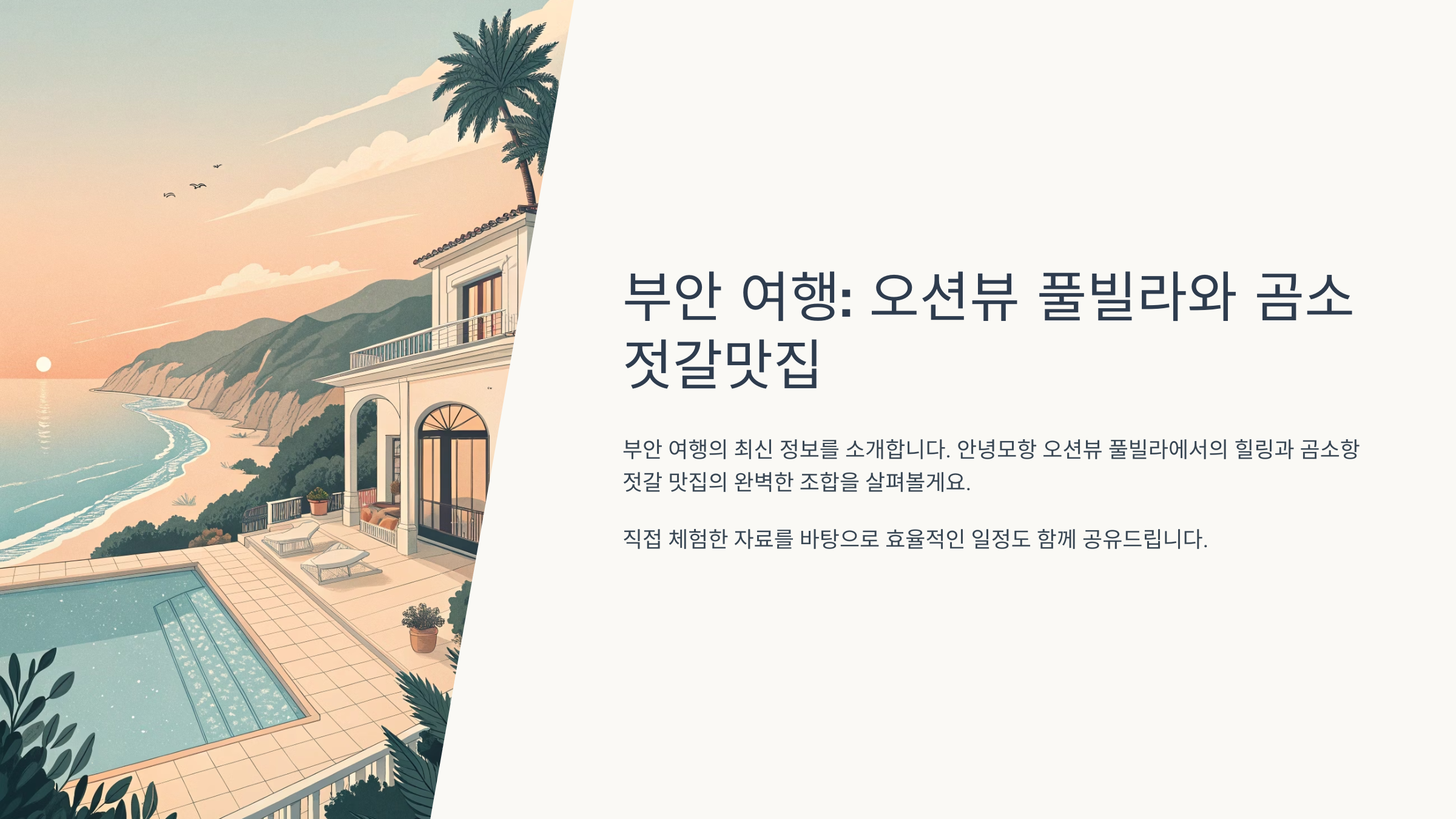 오늘은 '안녕모항 오션뷰 풀빌라'에서의 힐링 스테이와 곰소항의 젓갈 맛집의 완벽한 조합을 살펴볼게요.