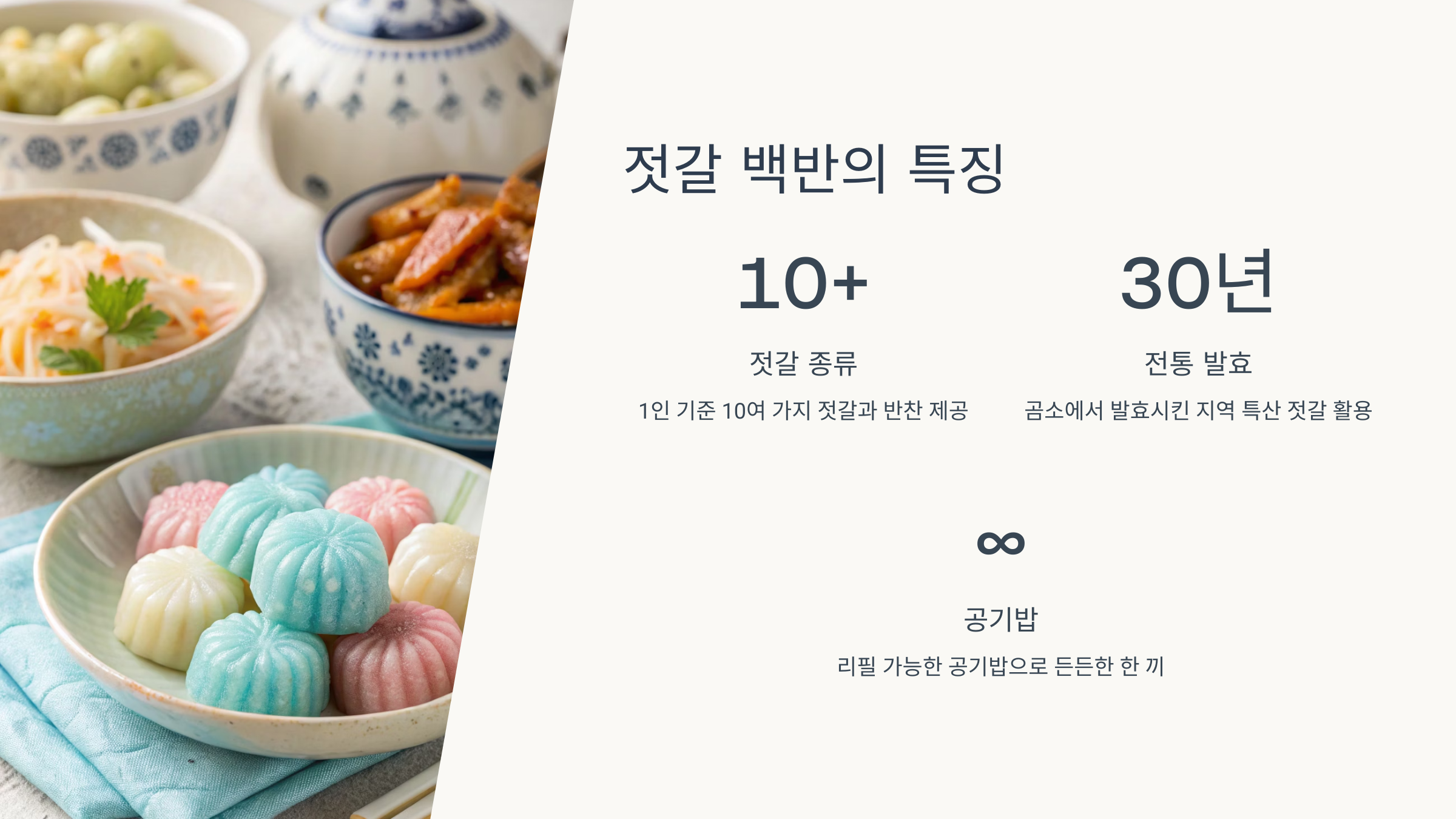 젓갈 백반 한 상차림은 부안이 자랑하는 특산 음식을 즐길 수 있는 새로운 경험이 될 것입니다.