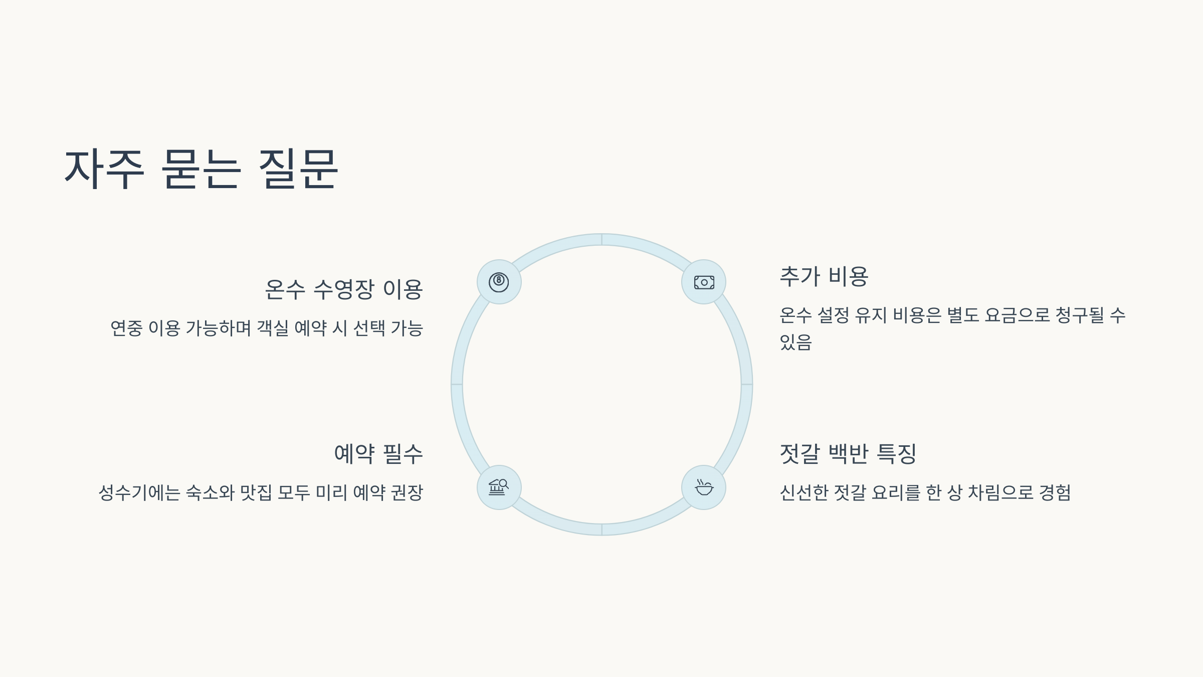| 안녕모항 풀빌라의 온수 수영장은 연중 이용 가능합니다. 풀빌라 내부에 위치한 개별 온수 풀은 계절과 관계없이 사용이 가능한 것이 특징입니다. 객실 예약 시 온수 수영장을 선택하면 추가적인 겨울철 낭만을 즐길 수 있습니다. 단, 온수 설정 유지 비용은 별도 요금으로 청구될 수 있는 점을 참고하세요. 고객 리뷰에 따르면 유지 관리가 훌륭하며 여행 중 힐링을 만끽할 수 있다고 합니다. |