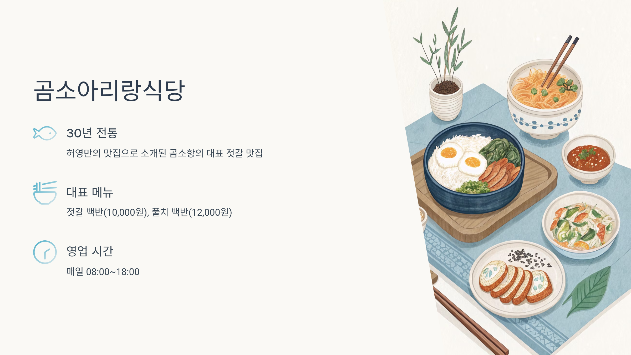 - 대표 메뉴: 젓갈 백반(10,000원), 풀치 백반(12,000원)