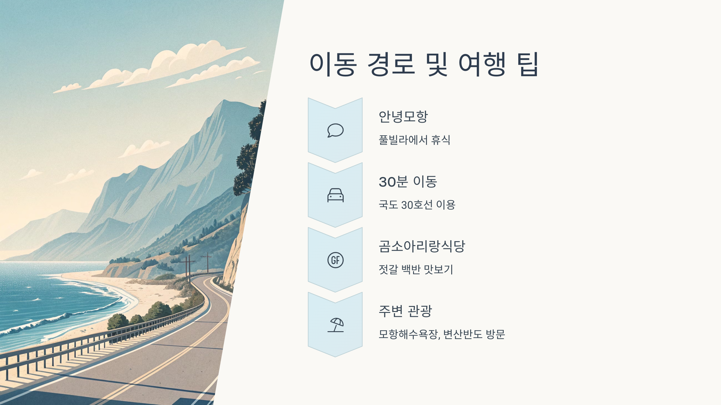 안녕모항 풀빌라에서의 프라이빗한 휴식과 곰소 아리랑식당에서의 젓갈 백반은 잊을 수 없는 추억을 제공합니다.