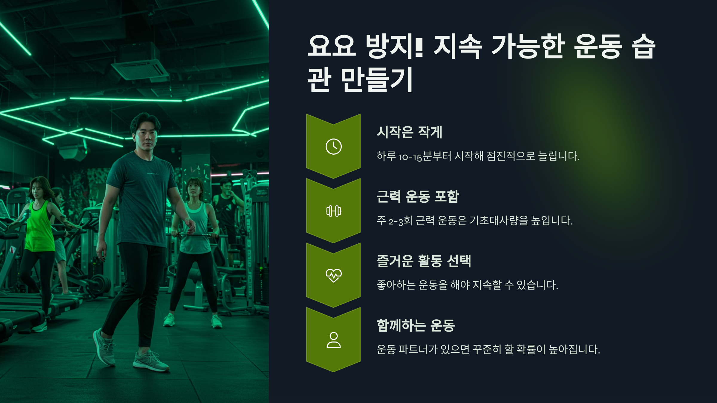 | 유산소 + 근력 병행 | 걷기, 조깅, 수영 등 유산소 운동과 스쿼트, 플랭크 등 근력 운동 조합 | 체지방 감소, 근육량 증가, 기초대사량 향상 |
