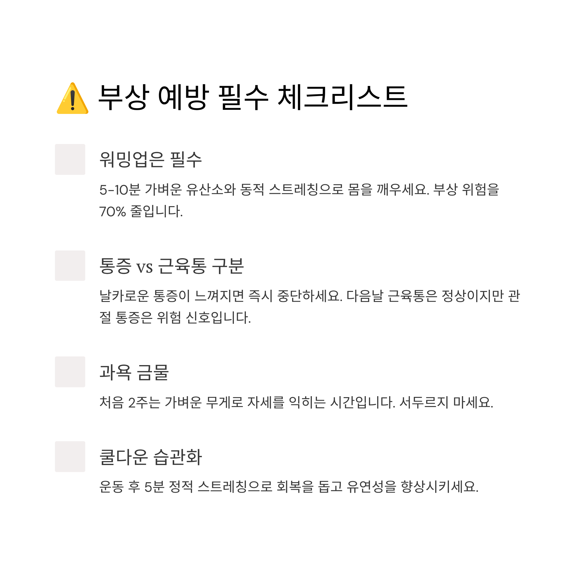 | 부상 예방 | 워밍업/쿨다운 필수, 정확한 자세, 점진적 강도 증가, 통증 시 중단 | 몸의 신호에 주의, 필요시 전문가 도움 |