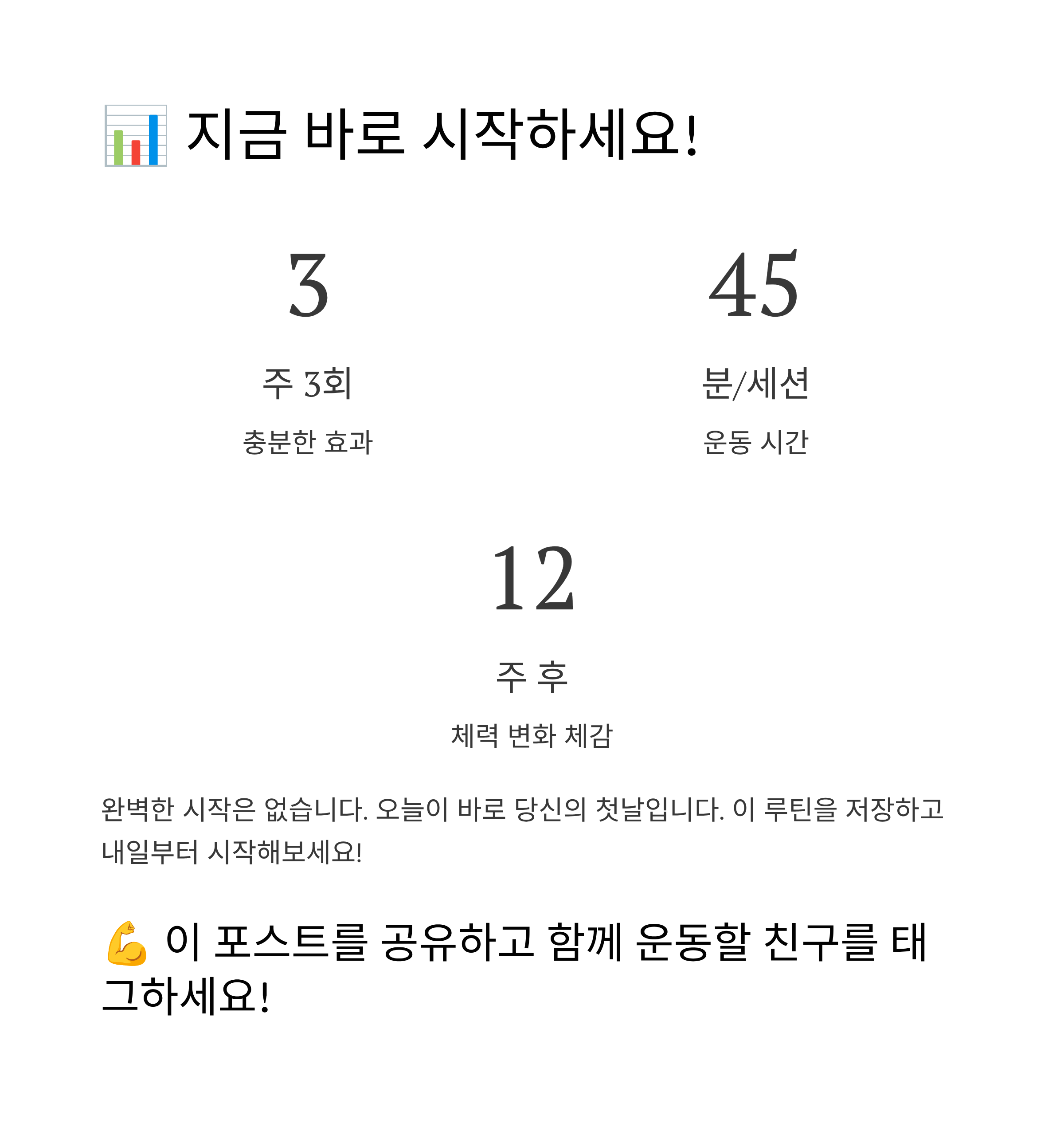 이 루틴은 초보자가 전신 근육을 고르게 자극하고 기본적인 운동 자세를 익히는 데 중점을 둡니다. 익숙해지면 점진적으로 강도를 높여나가세요. 🗓️