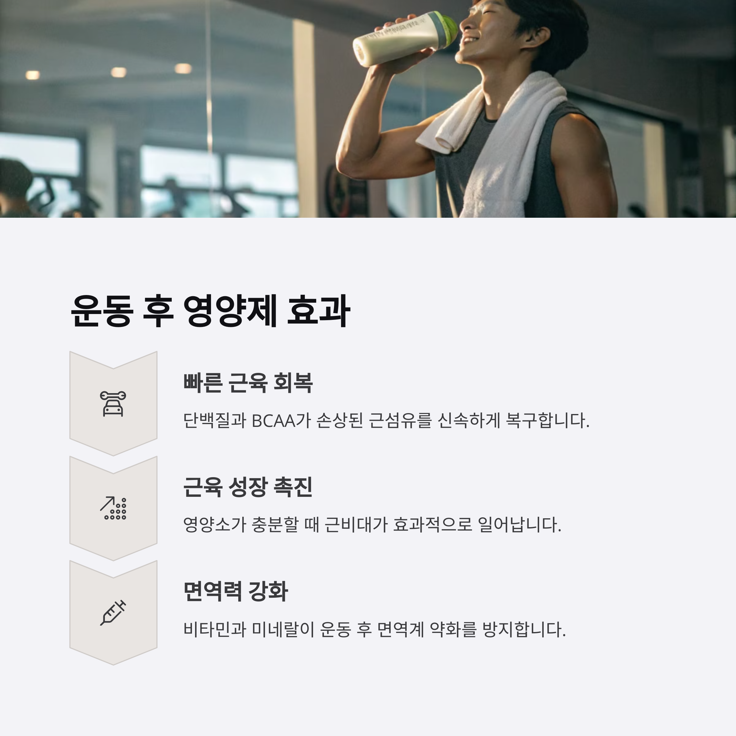 | 운동 직후 섭취 시 가장 효과적입니다. | 다양한 채소와 보충제로 섭취 가능 | 회복력을 높여 운동 지속력을 향상시킵니다. |