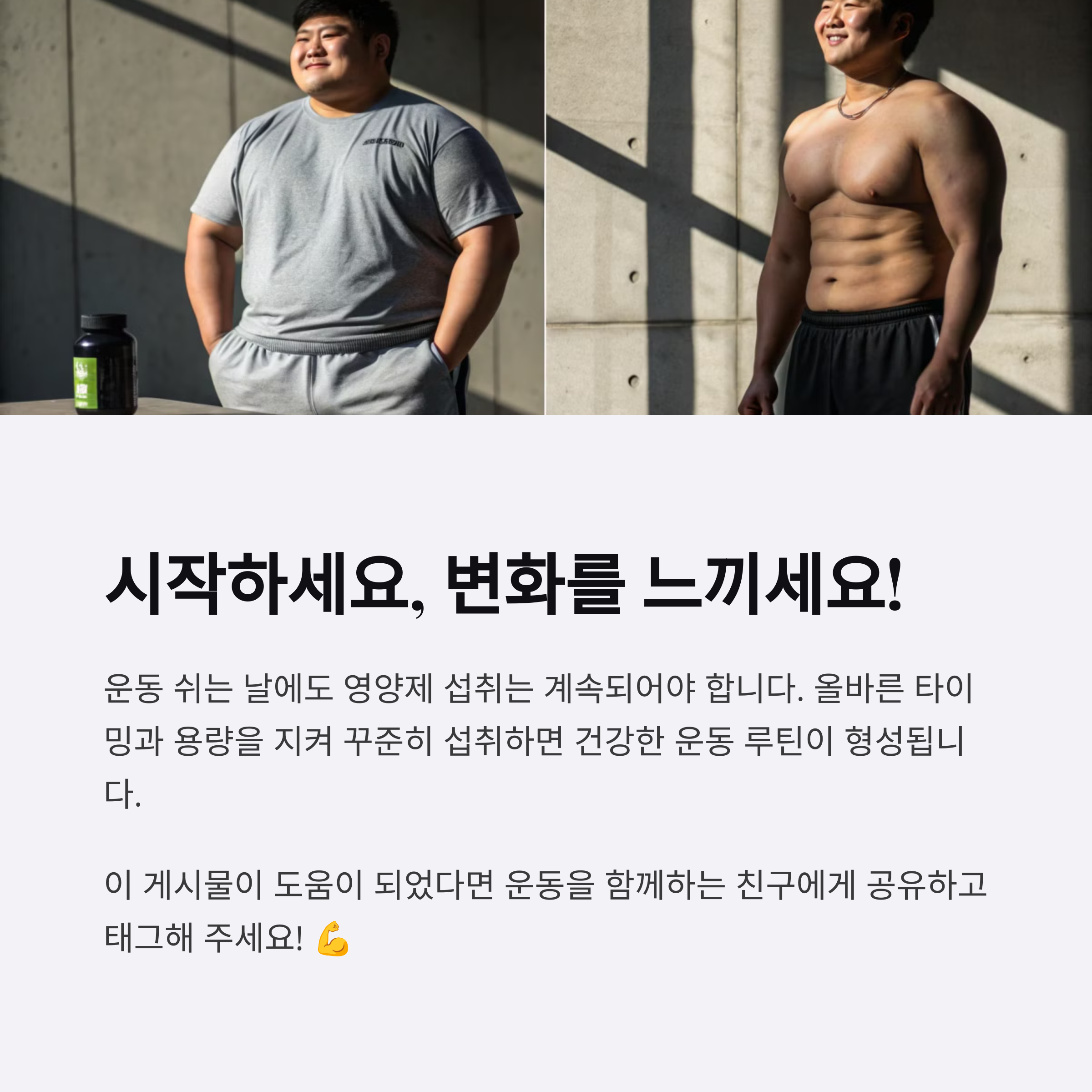 운동은 우리 몸을 변화시키는 가장 확실한 방법 중 하나입니다. 하지만 효과적인 변화를 위해서는 올바른 방식의 운동뿐만 아니라 그에 따른 영양 섭취도 필수적으로 따라와야 합니다. 오늘 소개한 단백질, 비타민, 기능성 보충제는 단순한 보조제가 아닌 운동 효과를 배가시켜주는 동반자라 할 수 있습니다. 꾸준한 운동과 균형 잡힌 영양제 섭취를 통해 더욱 건강한 몸과 삶의 질을 만들어보시길 바랍니다.