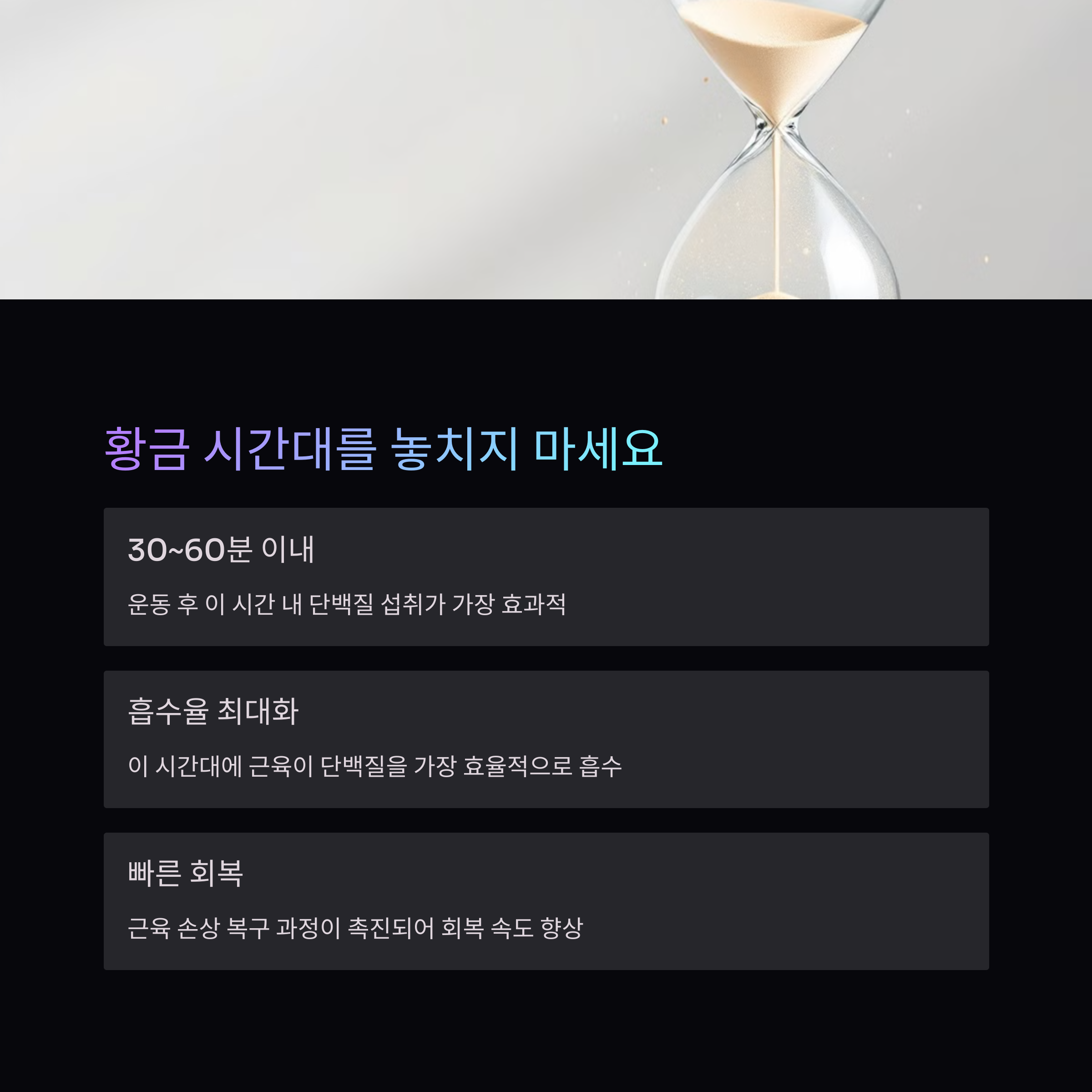 | 단백질 합성 | 운동 후 30~60분 이내 섭취 시 단백질 합성 극대화 |