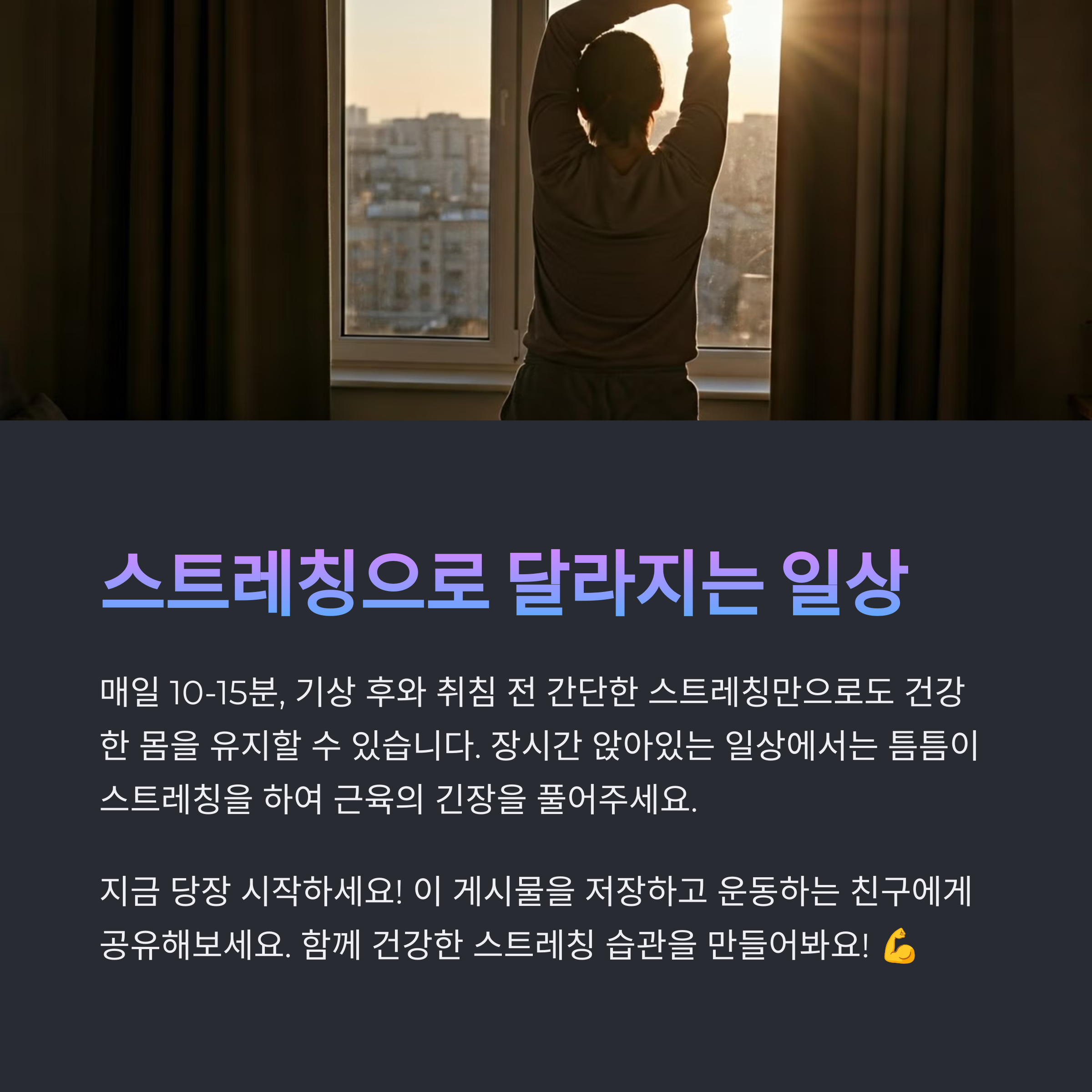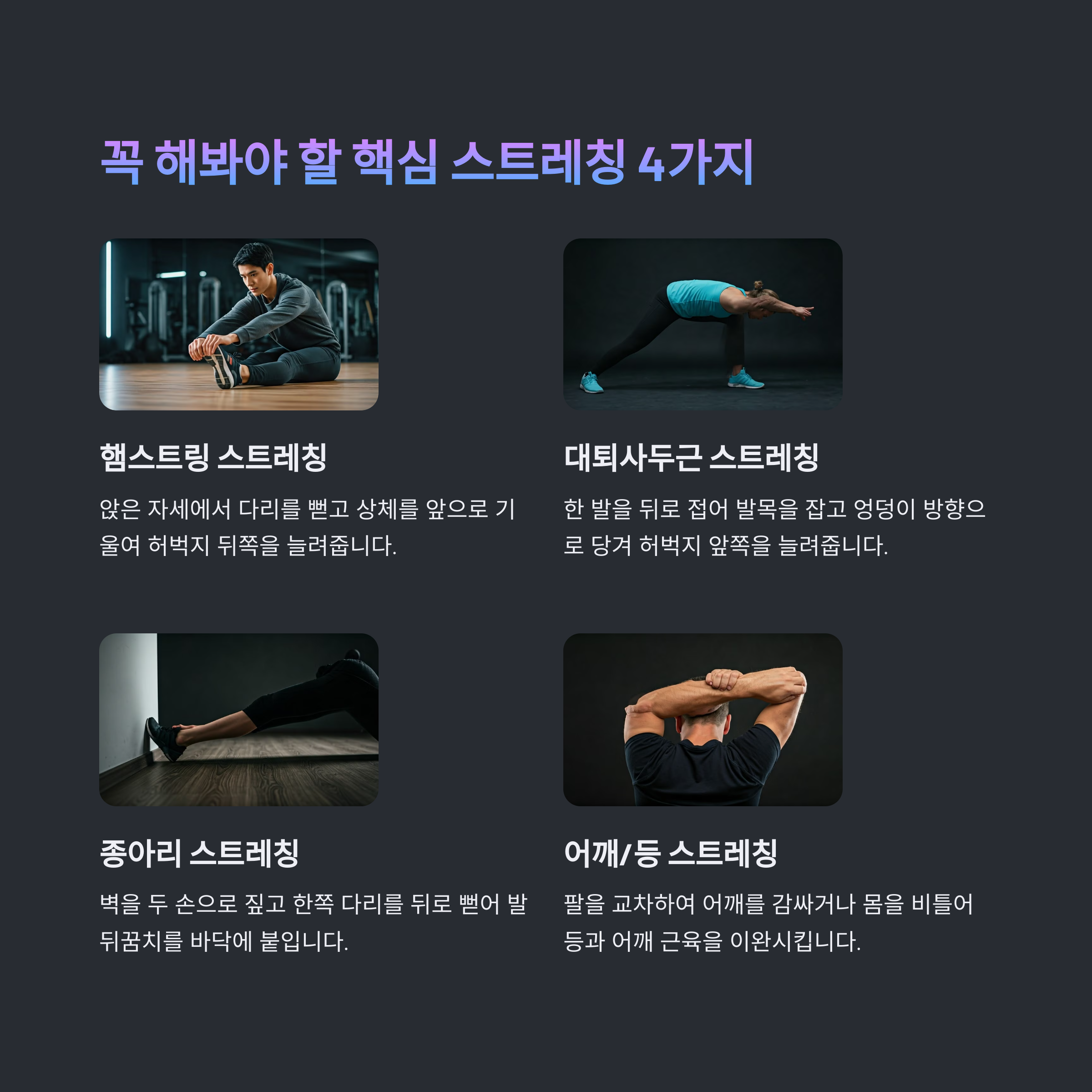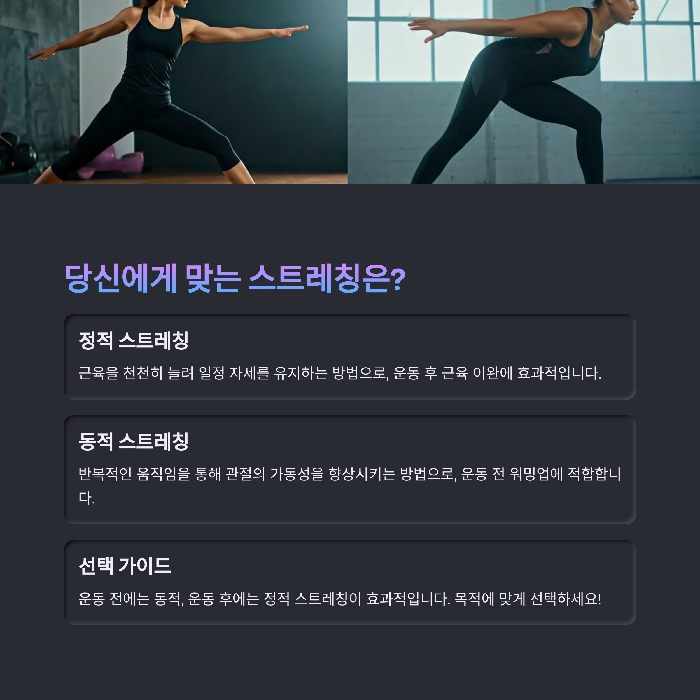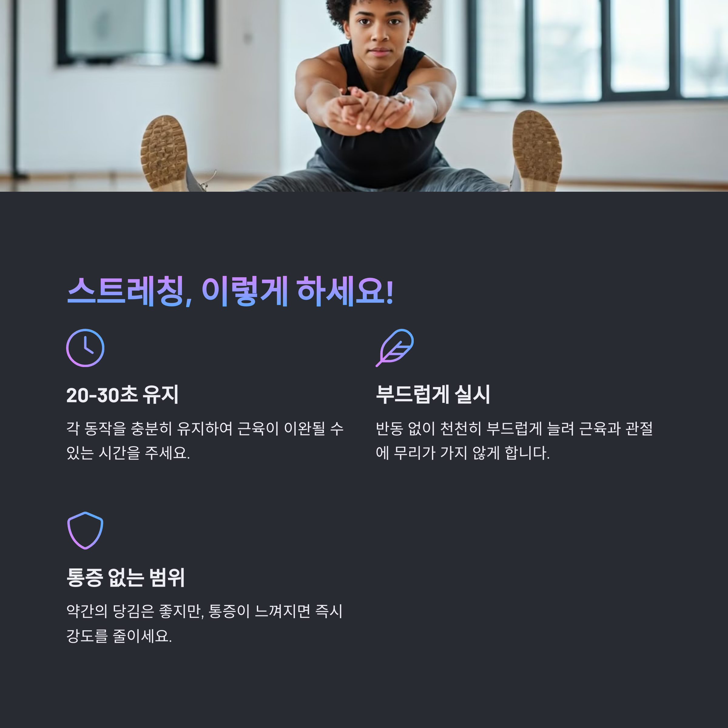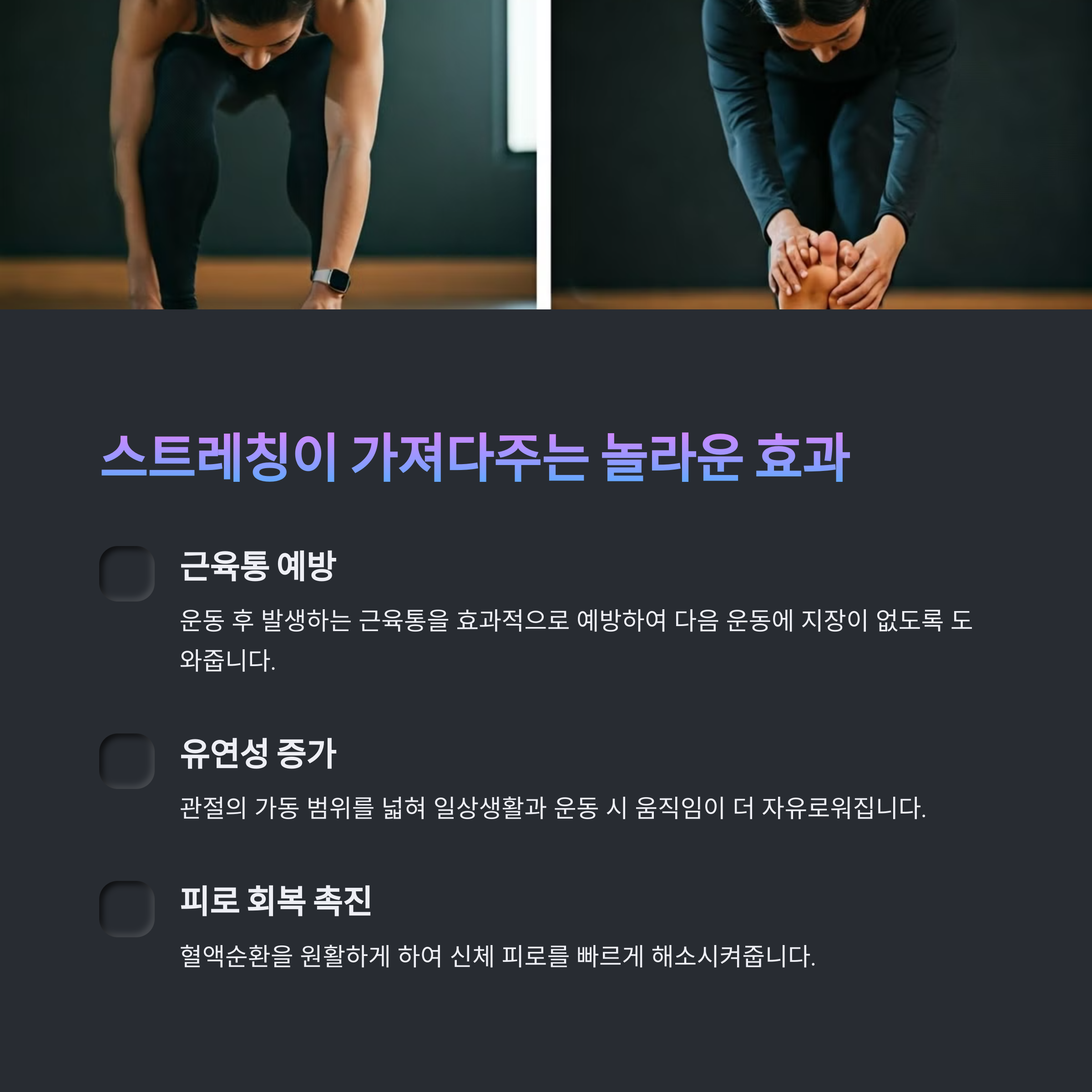 | 운동 후 스트레칭은 근육을 이완시키고 유연성을 향상시킵니다. | 스트레칭을 통해 피로를 빠르게 회복하고 근육의 탄력성을 높입니다. | 근육 이완을 돕는 다양한 스트레칭 동작으로 부상을 예방합니다. |