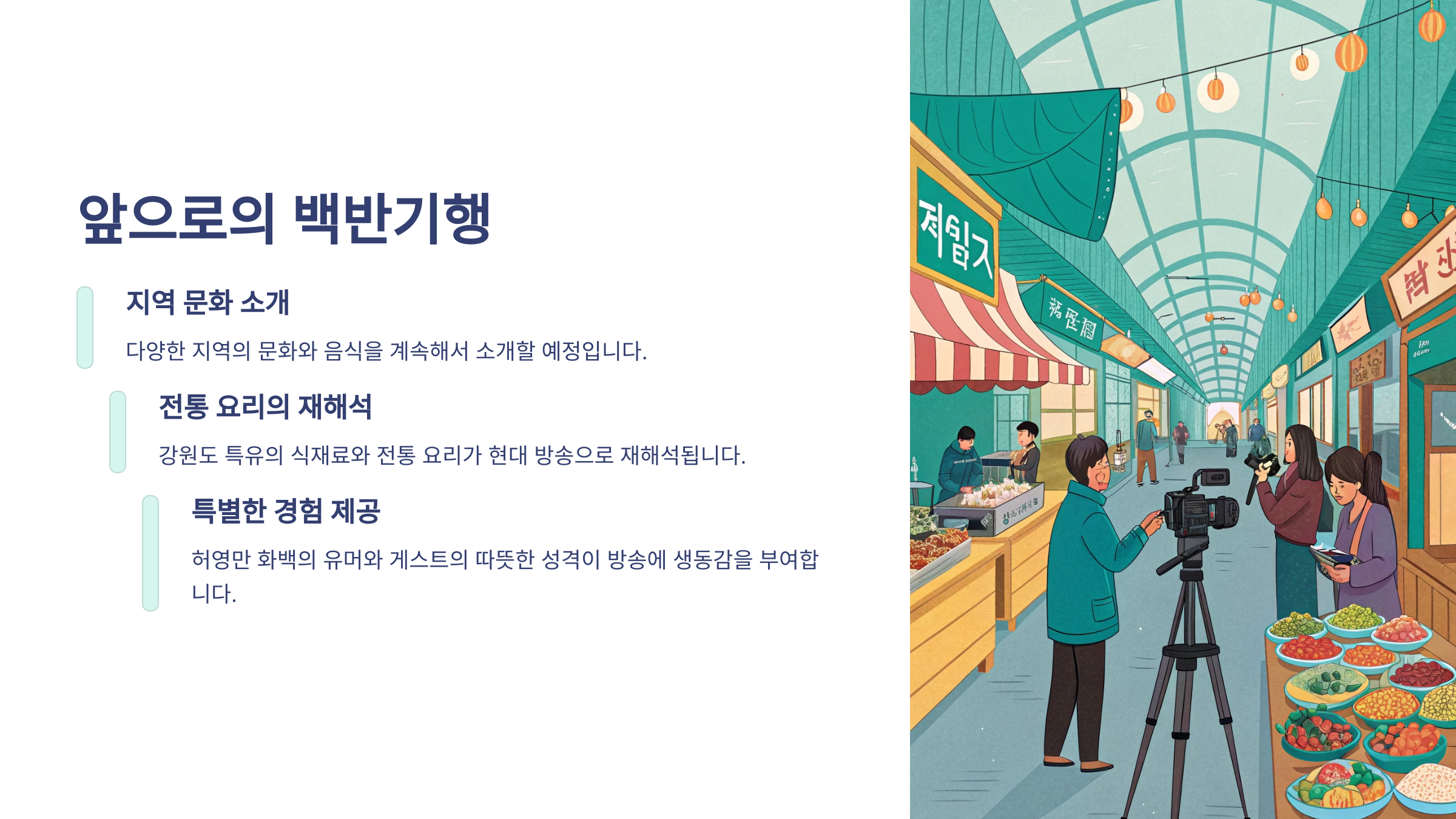 앞으로도 백반기행은 다양한 지역 문화와 음식을 소개하며 시청자에게 특별한 경험을 선사할 것입니다.