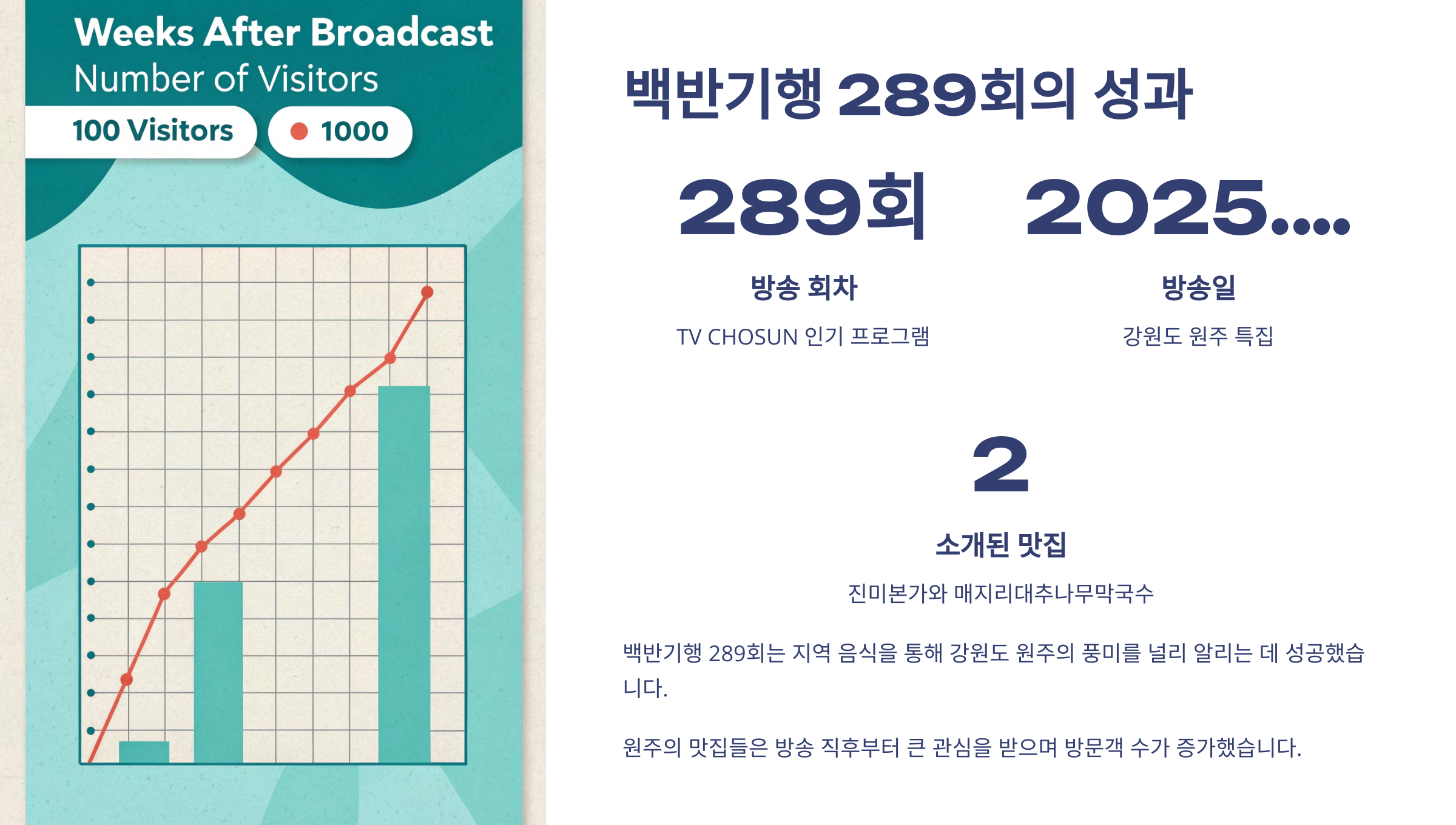 백반기행 289회는 지역 음식을 통해 강원도 원주의 풍미를 널리 알리는 데 성공한 에피소드로 평가받았습니다.