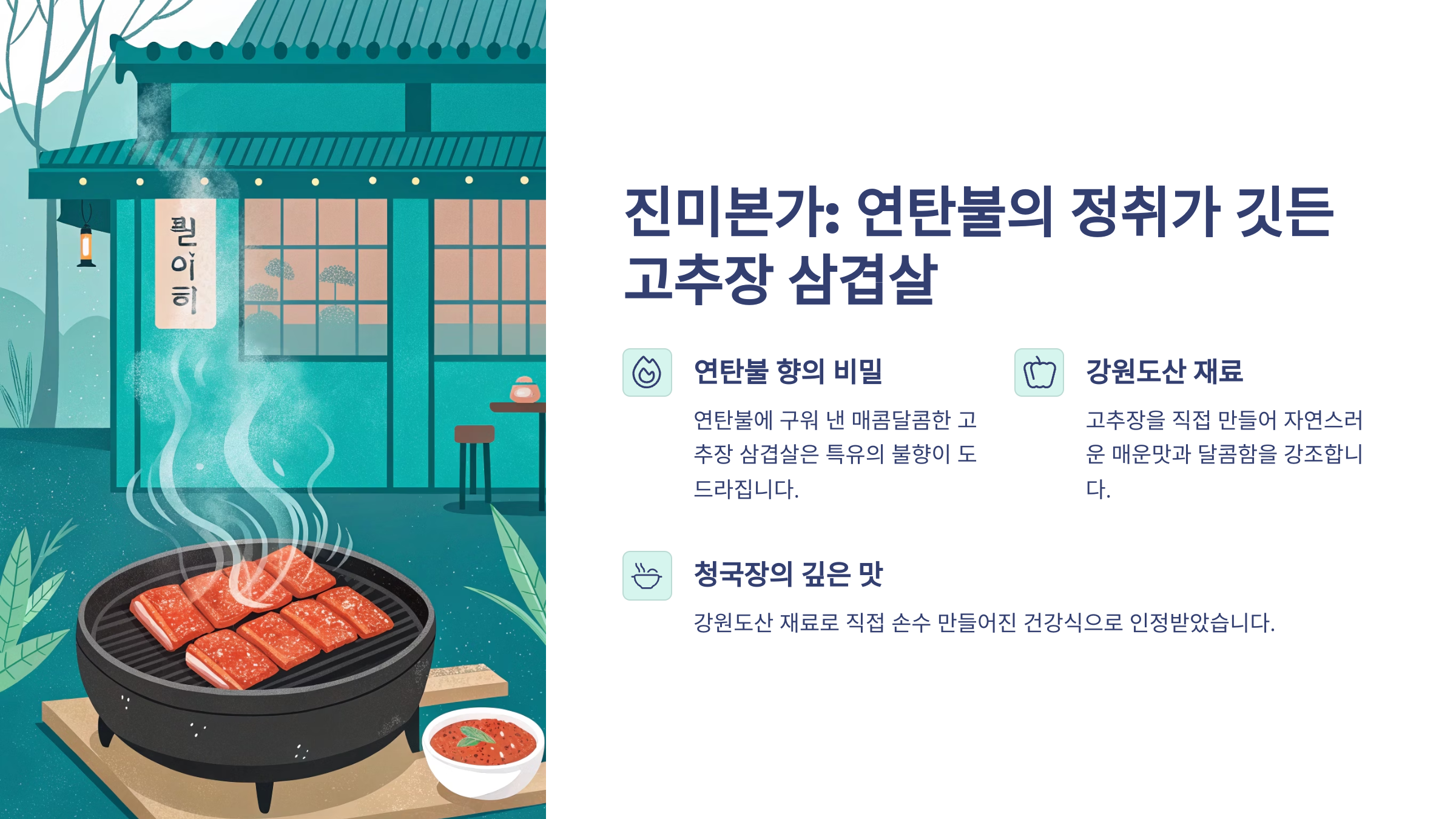 | 진미본가 고추장 삼겹살의 특별한 맛은 연탄불 향에서 나옵니다. 강원도산 재료를 활용하여 고추장을 직접 만들어 자연스러운 매운맛과 달콤함을 강조합니다. 연탄불에 구워 육즙이 살아 있으면서도 특유의 불향이 도드라집니다. 이 메뉴는 과도하게 짜거나 자극적이지 않아 누구나 편하게 즐길 수 있습니다. 더불어, 청국장과 함께 제공되어 한식 밥상의 완벽한 조화를 보여줍니다. |