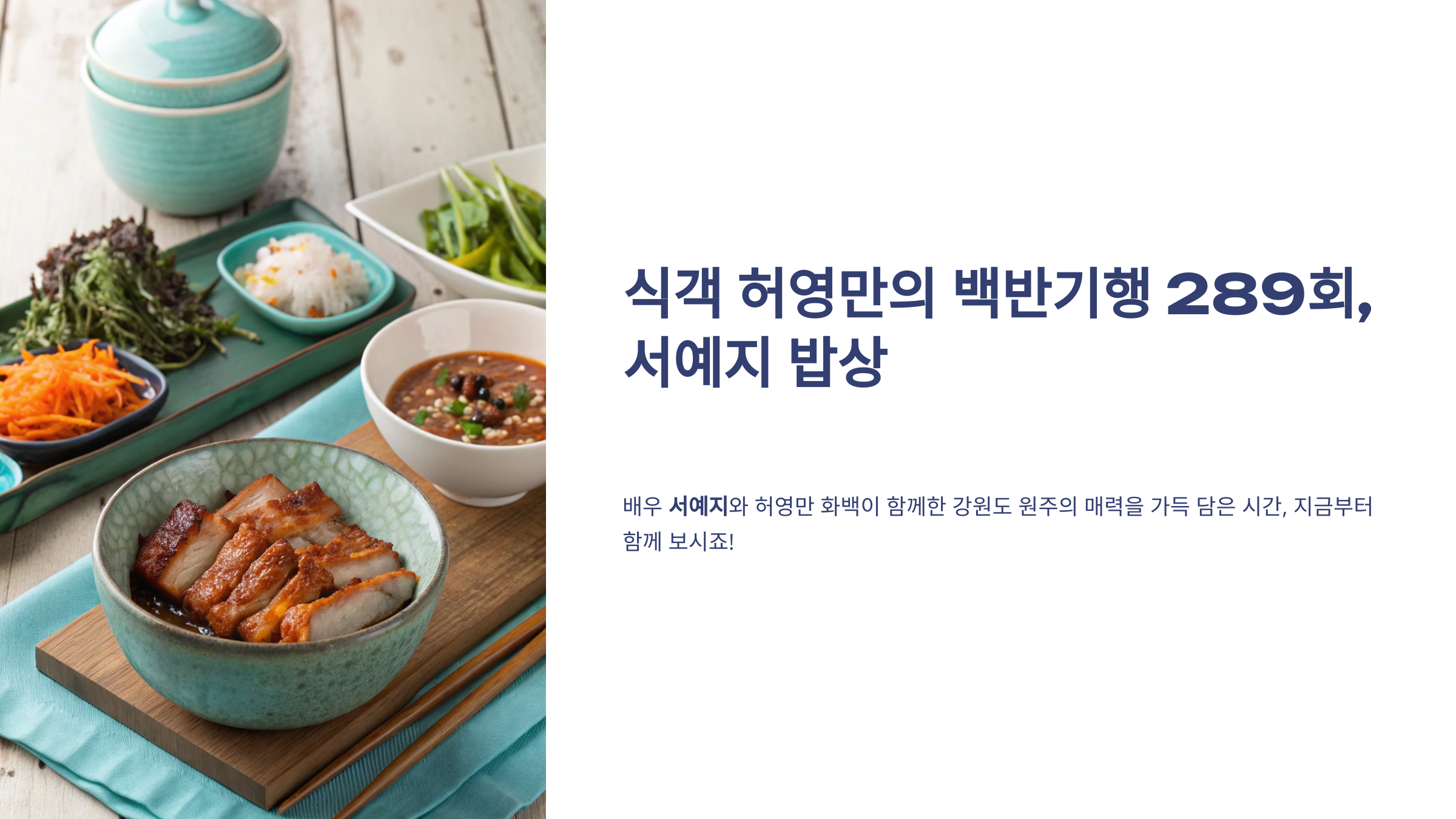오늘은 TV CHOSUN에서 방영된 인기 프로그램 식객 허영만의 백반기행 289회 원주편 이야기를 소개드립니다. 배우 서예지와 허영만 화백이 함께한 강원도 원주의 매력을 가득 담은 시간, 지금부터 함께 보시죠!