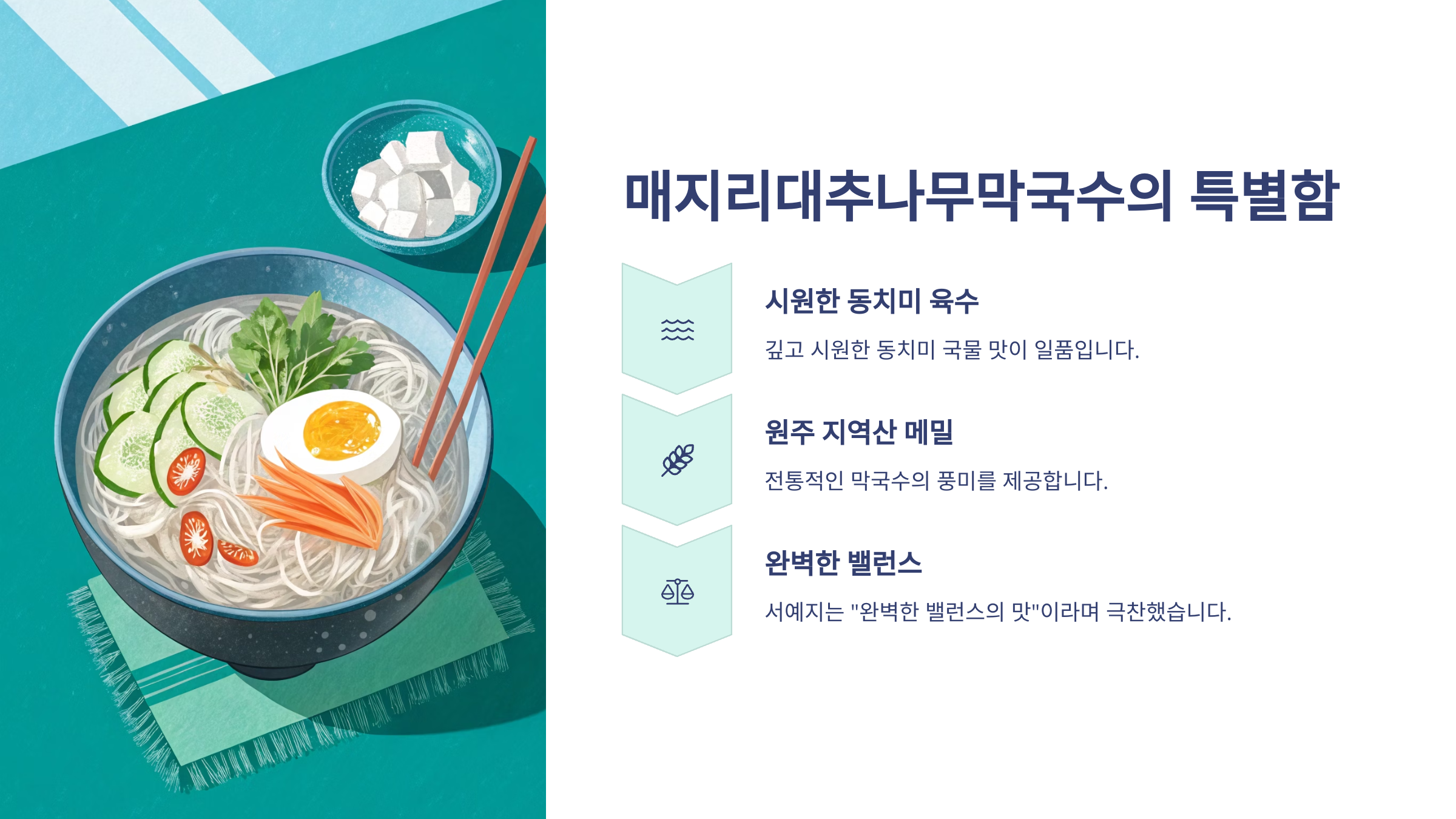 | 매지리대추나무막국수의 동치미 물막국수는 기존의 막국수와는 다른 깔끔한 국물 맛이 특징입니다. 동치미 육수로 만들어 국물 맛이 시원하면서도 감칠맛이 뛰어납니다. 이 육수와 함께 사용하는 메밀면은 원주 지역산 메밀로 만들어 전통적인 막국수의 풍미를 제공합니다. 서예지와 허영만 화백 모두 이 메뉴에 대해 "완벽한 밸런스"라며 극찬하였습니다. 대추막국수로도 유명한 이곳은 다양한 메뉴로 지역성을 알리고 있습니다. |