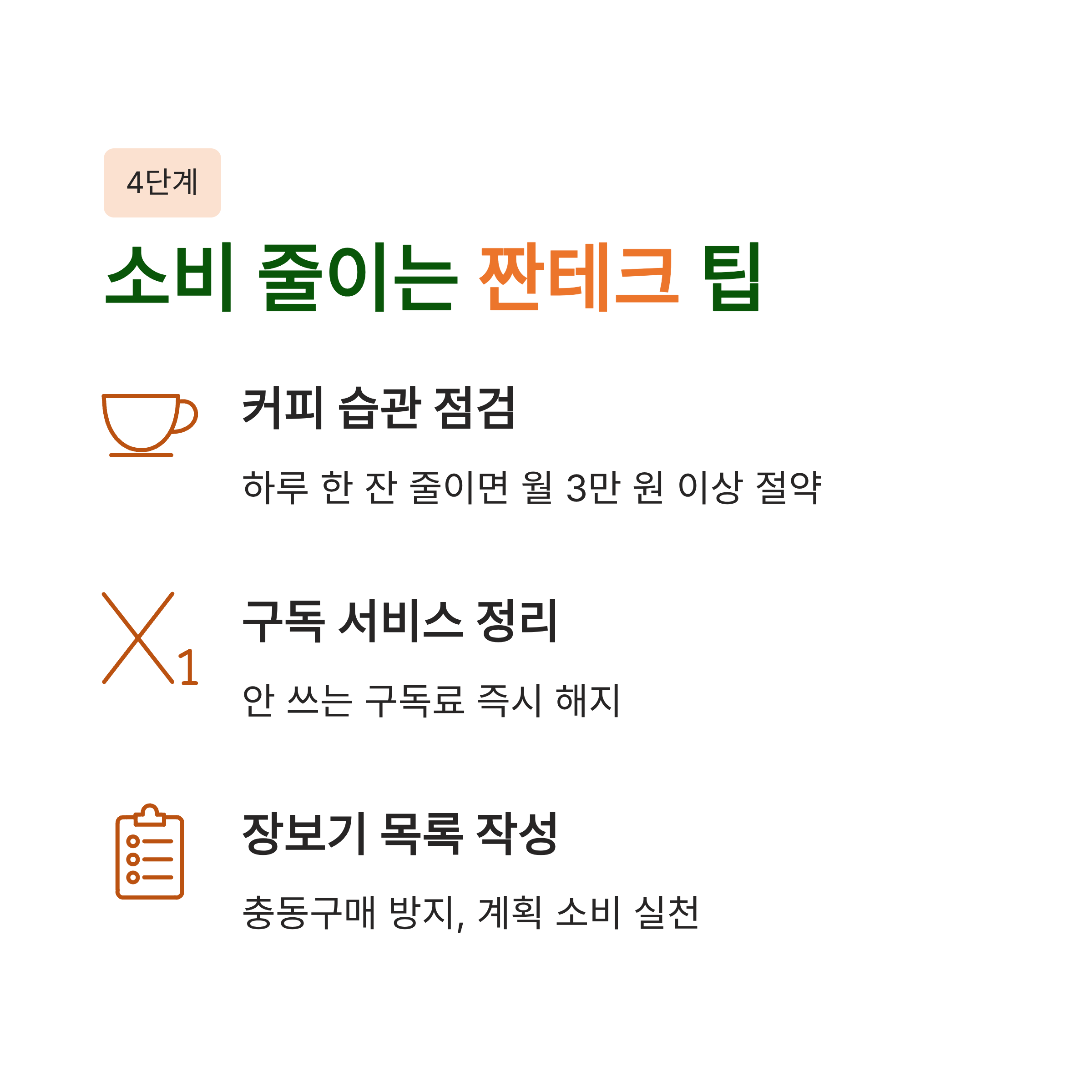 - 구독 다이어트: 넷플릭스, 유튜브 프리미엄, 각종 앱 구독 중 1개월 이상 안 쓴 것은 지금 당장 해지하세요.