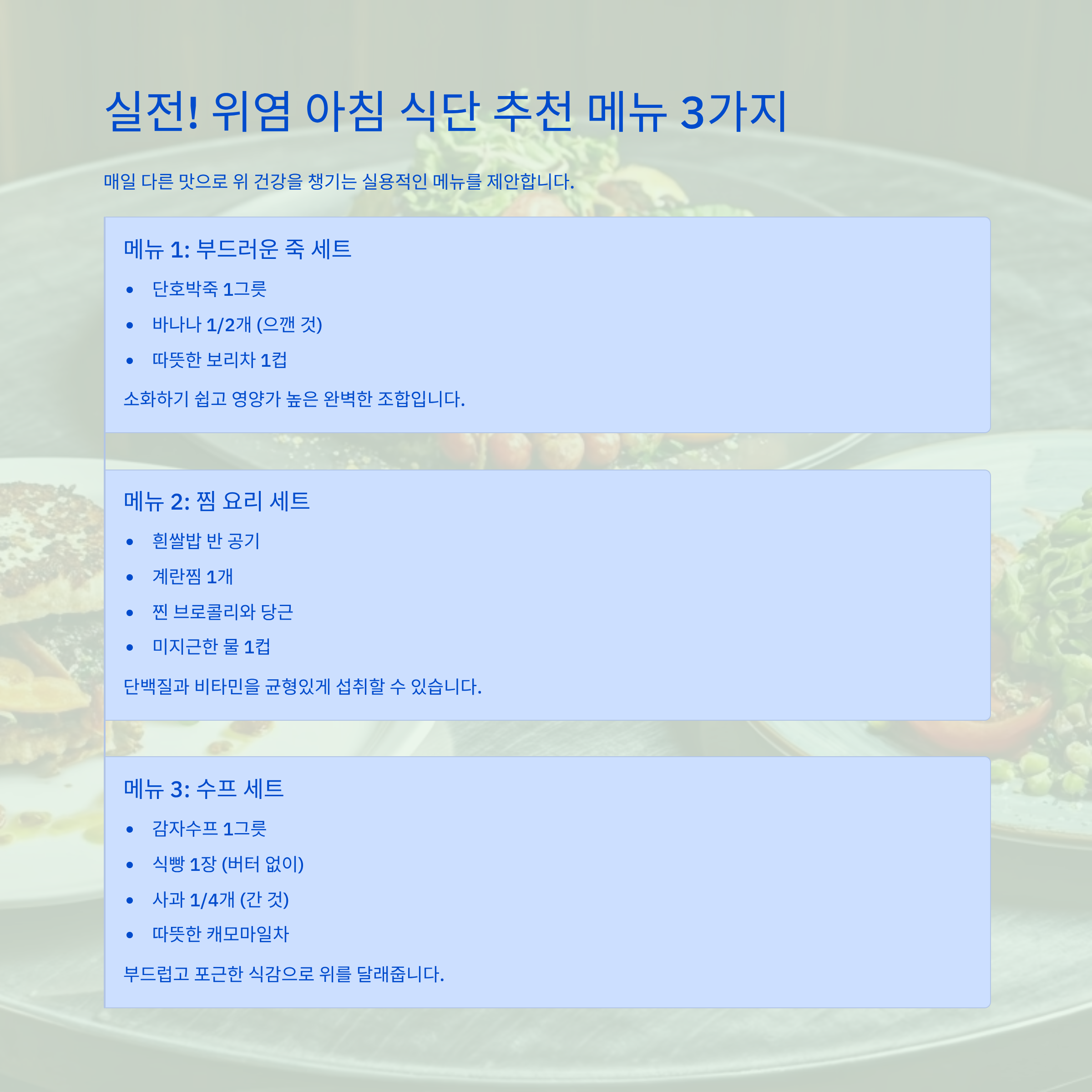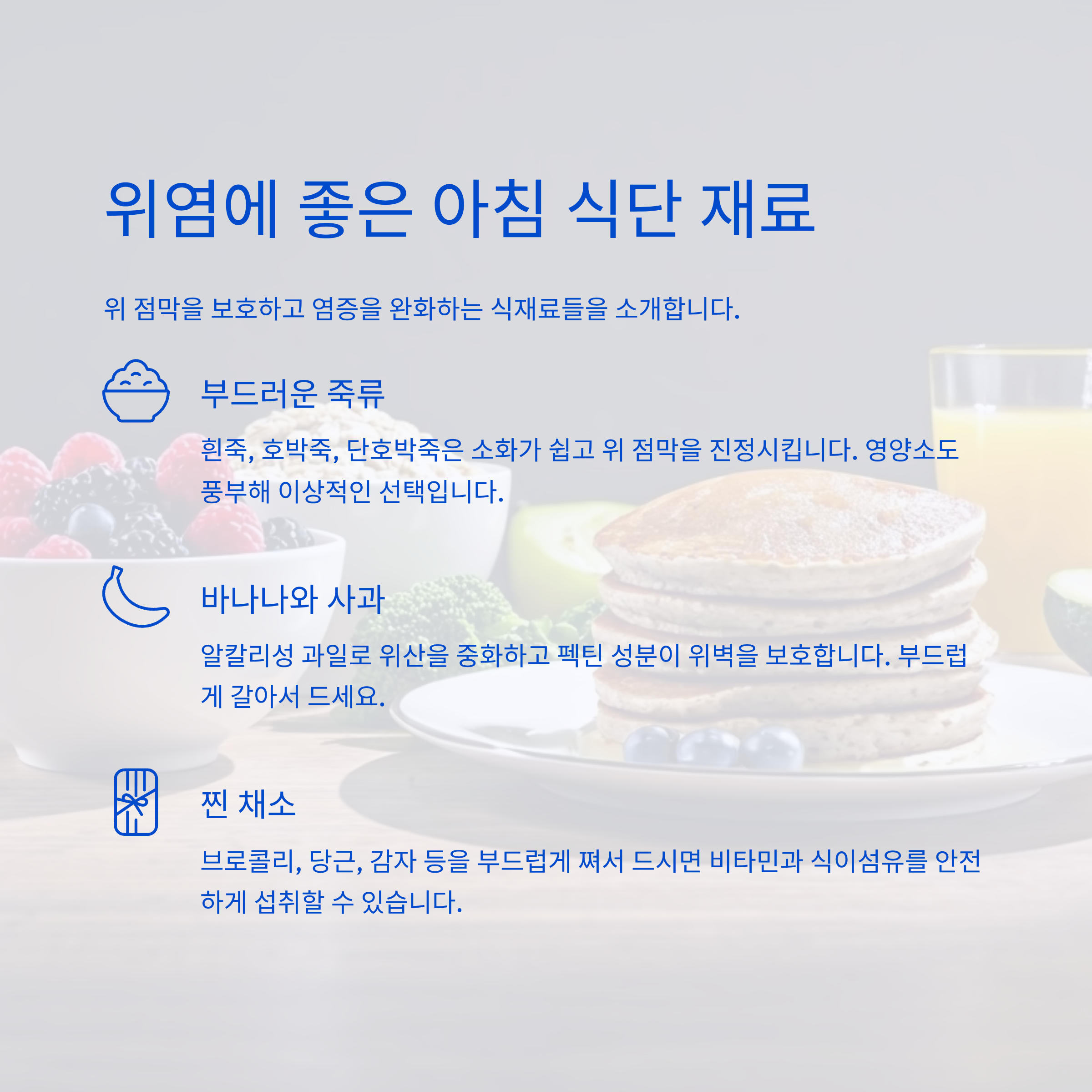 이 메뉴들은 위에 부담을 최소화하면서도 영양 균형을 잡을 수 있도록 구성되었습니다. 자신에게 맞는 레시피로 매일 아침 위를 달래주세요.