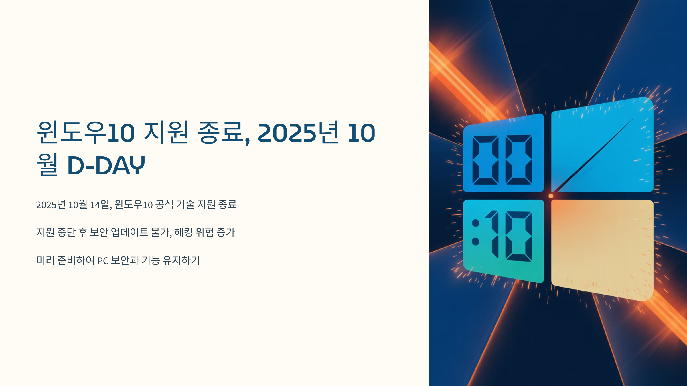 2025년 10월 14일, 마이크로소프트(MS) 윈도우10의 공식 기술 지원이 마침내 종료됩니다. 전 세계 수많은 PC 사용자들이 오랫동안 의지해 온 운영체제가 역사 속으로 사라지는 중요한 전환점입니다. 지원 종료일이 다가옴에 따라 "내 컴퓨터는 어떻게 되는 거지?", "계속 써도 문제는 없을까?", "무엇을 준비해야 할까?"와 같은 불안과 궁금증이 커지고 있습니다. 이 포스트에서는 윈도우10 지원 종료의 정확한 의미, 사용자에게 닥칠 수 있는 실질적인 위험, 그리고 현명하게 대처하기 위한 구체적인 준비 사항들을 총정리하여 여러분의 안전한 PC 생활을 위한 완벽 가이드를 제공하고자 합니다. 더 이상 혼란스러워하지 마세요, 지금 바로 이 글을 통해 명쾌한 해답을 찾으시길 바랍니다!
