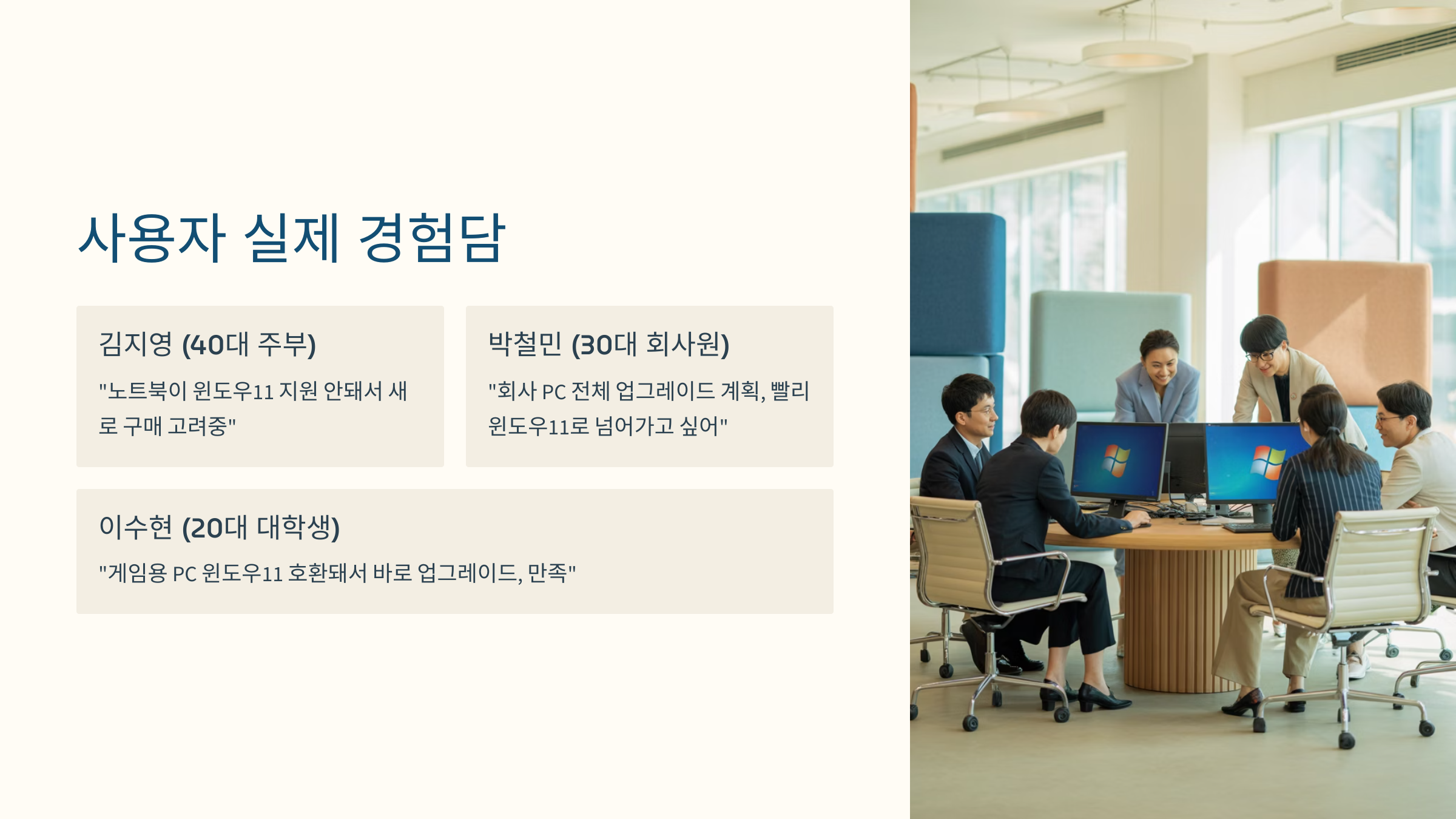개인적으로는 빨리 윈도우11 환경으로 넘어가고 싶어요.” – 박철민 (회사원, 30대)“저는 게임 때문에 PC 사양에 민감한 편인데, 다행히 제 PC는 윈도우11 지원이 되더라고요.