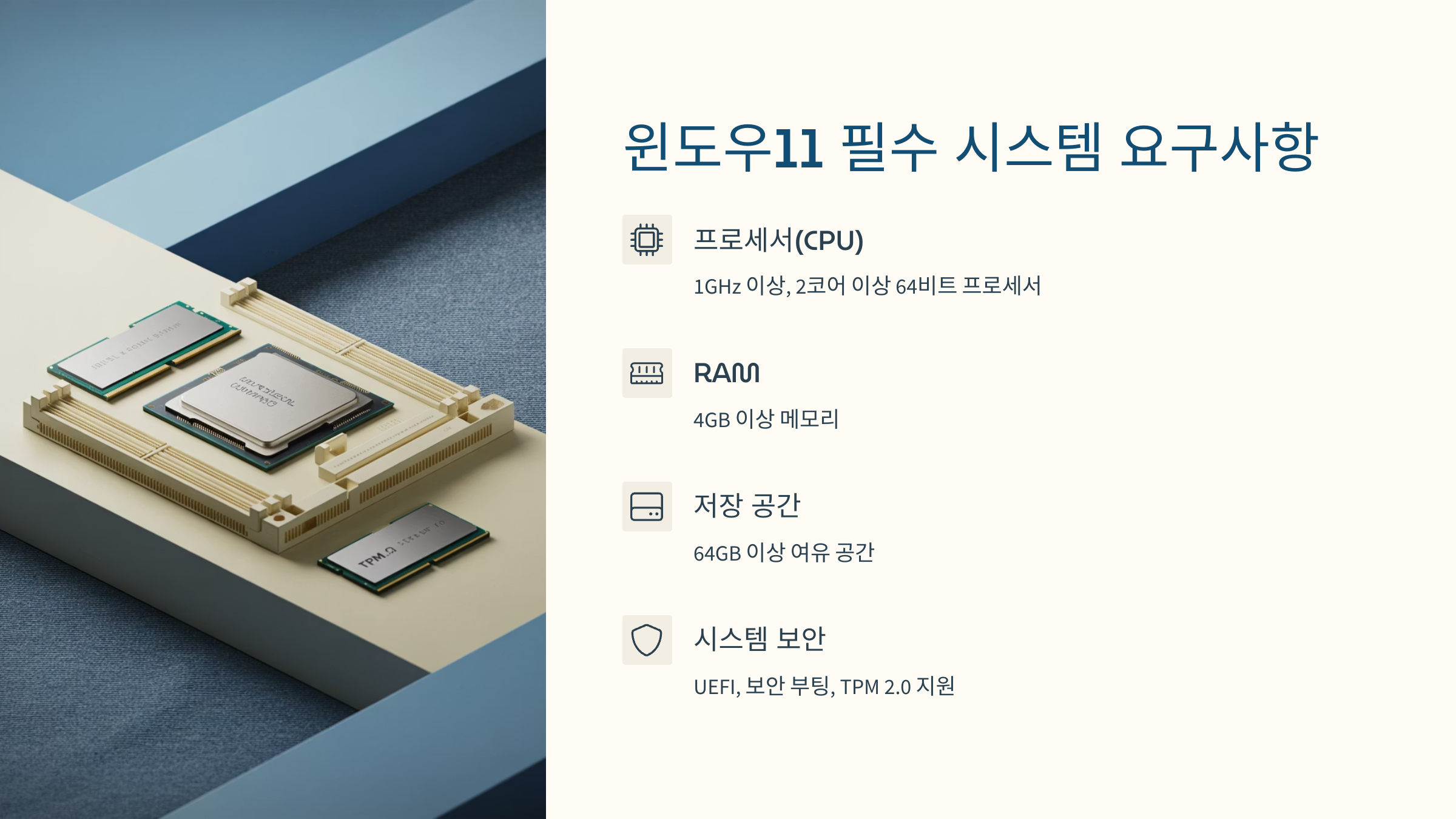 - 프로세서(CPU): 1GHz 이상, 2개 이상의 코어를 가진 호환되는 64비트 프로세서 또는 SoC (대략 인텔 8세대 이상, AMD 라이젠 2000 시리즈 이상 권장)