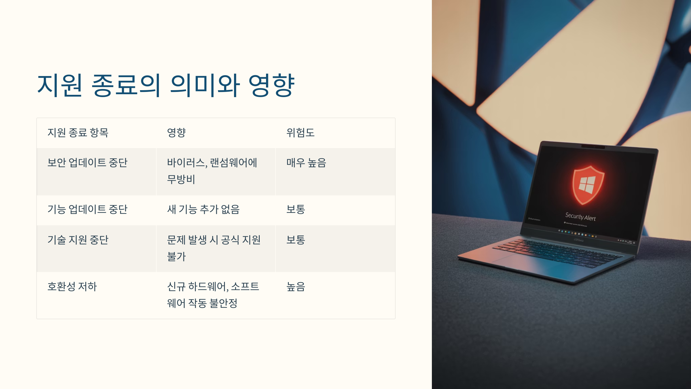 | 지원 종료 항목 | 구체적인 내용 및 사용자 영향 | 위험도 및 중요도 |
