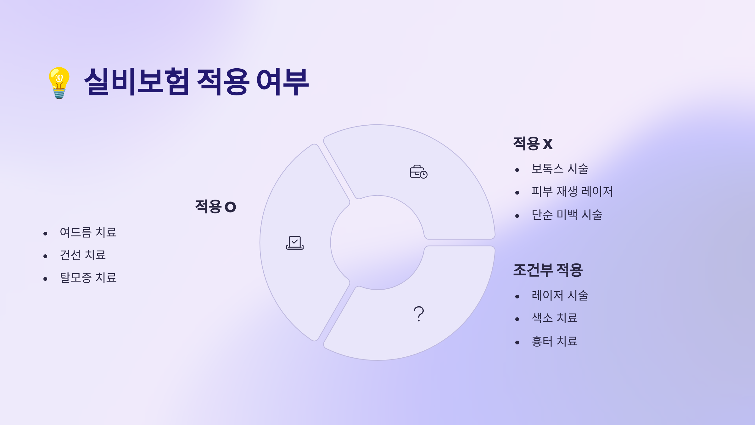 - 미용 목적 (적용 X): 단순 잡티/주근깨 제거, 보톡스/필러, 제모, 리프팅, 단순 미용 목적의 점 제거 등 질병 치료와 직접적인 관련이 없는 경우.