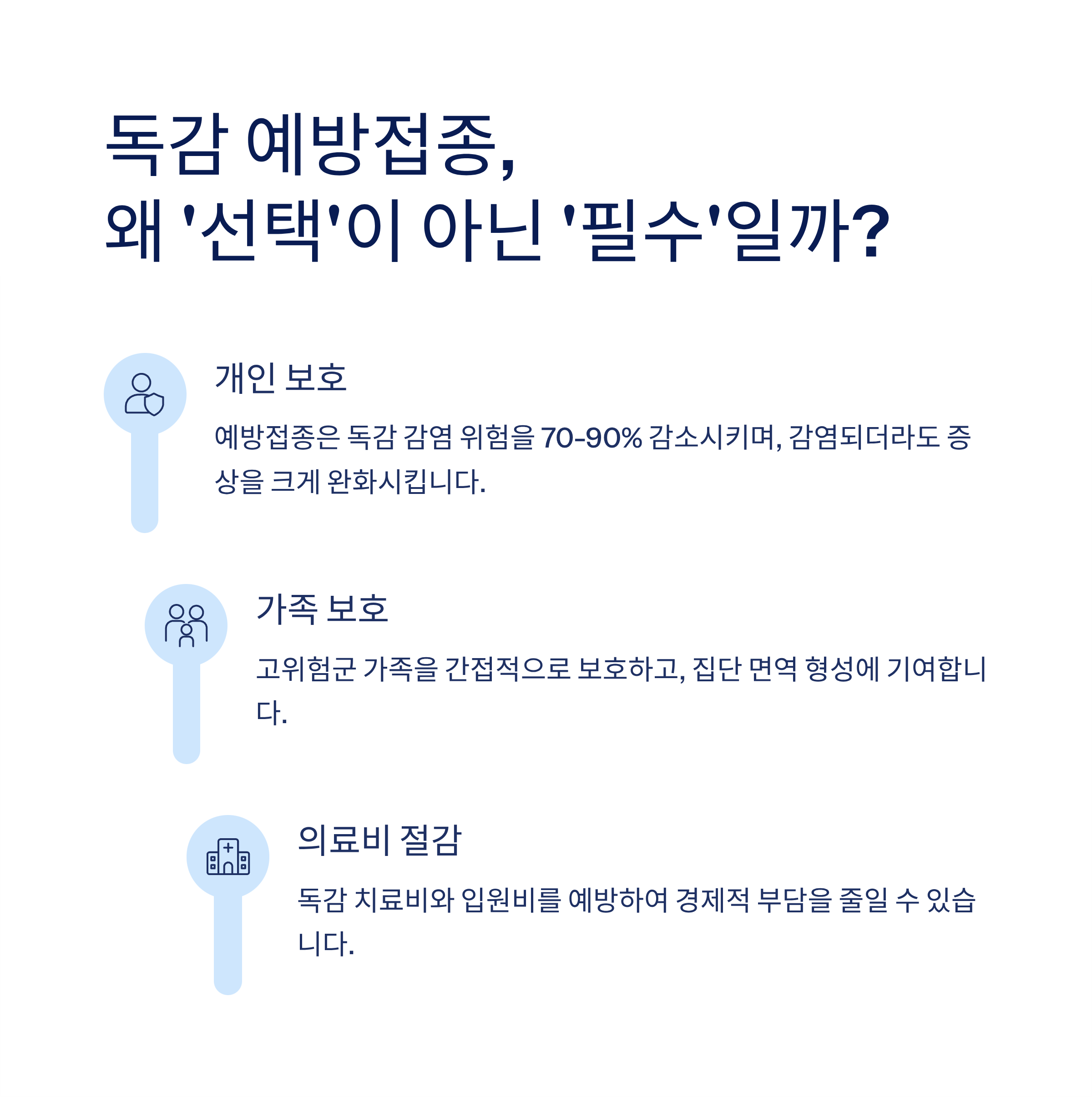 1. 나를 지키는 가장 확실한 방법: 예방접종은 독감 감염 가능성을 70~90%까지 낮춰줍니다. 만약 감염되더라도 증상을 완화하고 입원이나 사망과 같은 심각한 합병증으로 진행될 위험을 크게 줄여줍니다.