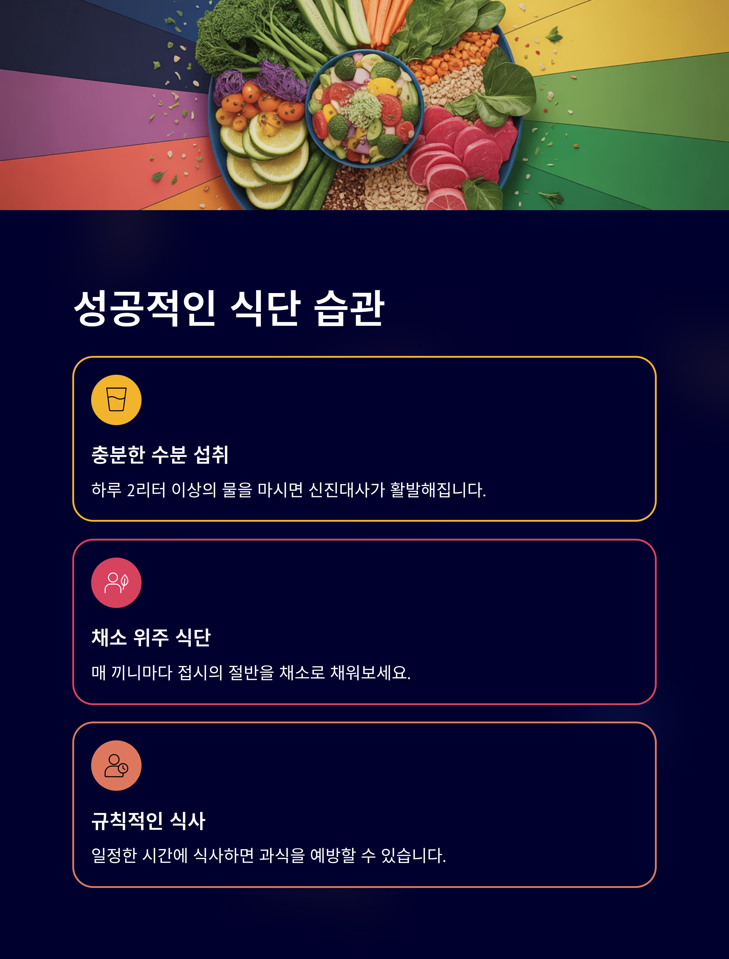 - 팁: 하루 2리터 이상의 물을 충분히 마시세요. 물은 신진대사를 촉진하고, 노폐물 배출을 돕고, 포만감을 주어 식사량 조절에도 효과적입니다. 식사 30분 전 물 한 잔은 과식을 막아줍니다.