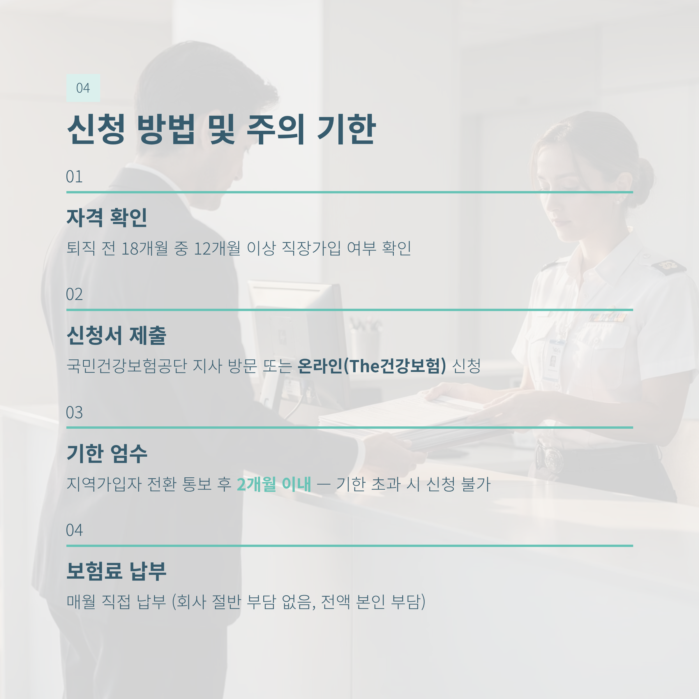 - 직장 가입 기간: 퇴직 전 18개월 이내에 통산 1년 이상 직장 가입자 자격 유지