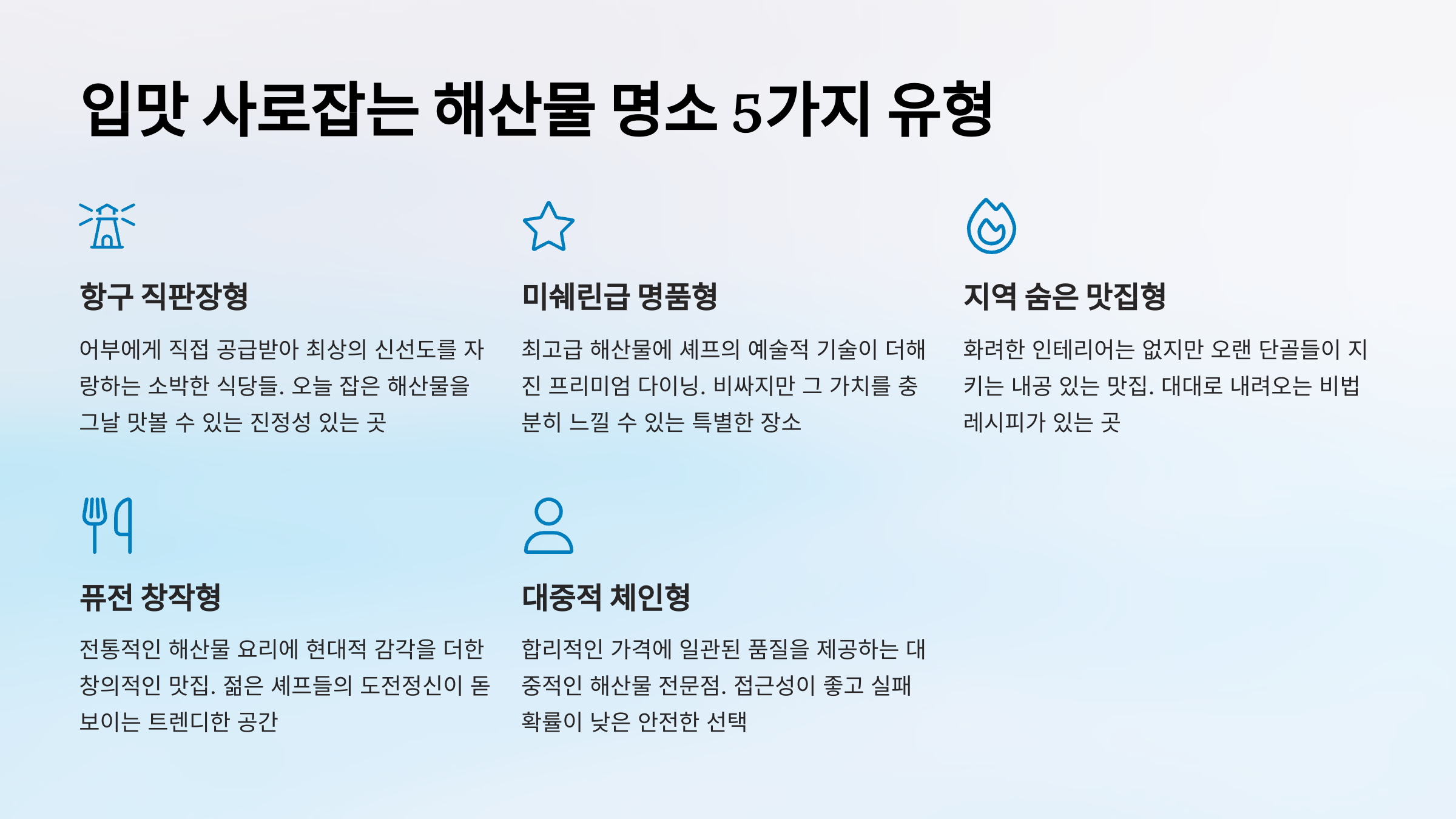💡 현실 속 바다: 입맛 사로잡는 해산물 명소 5가지 유형