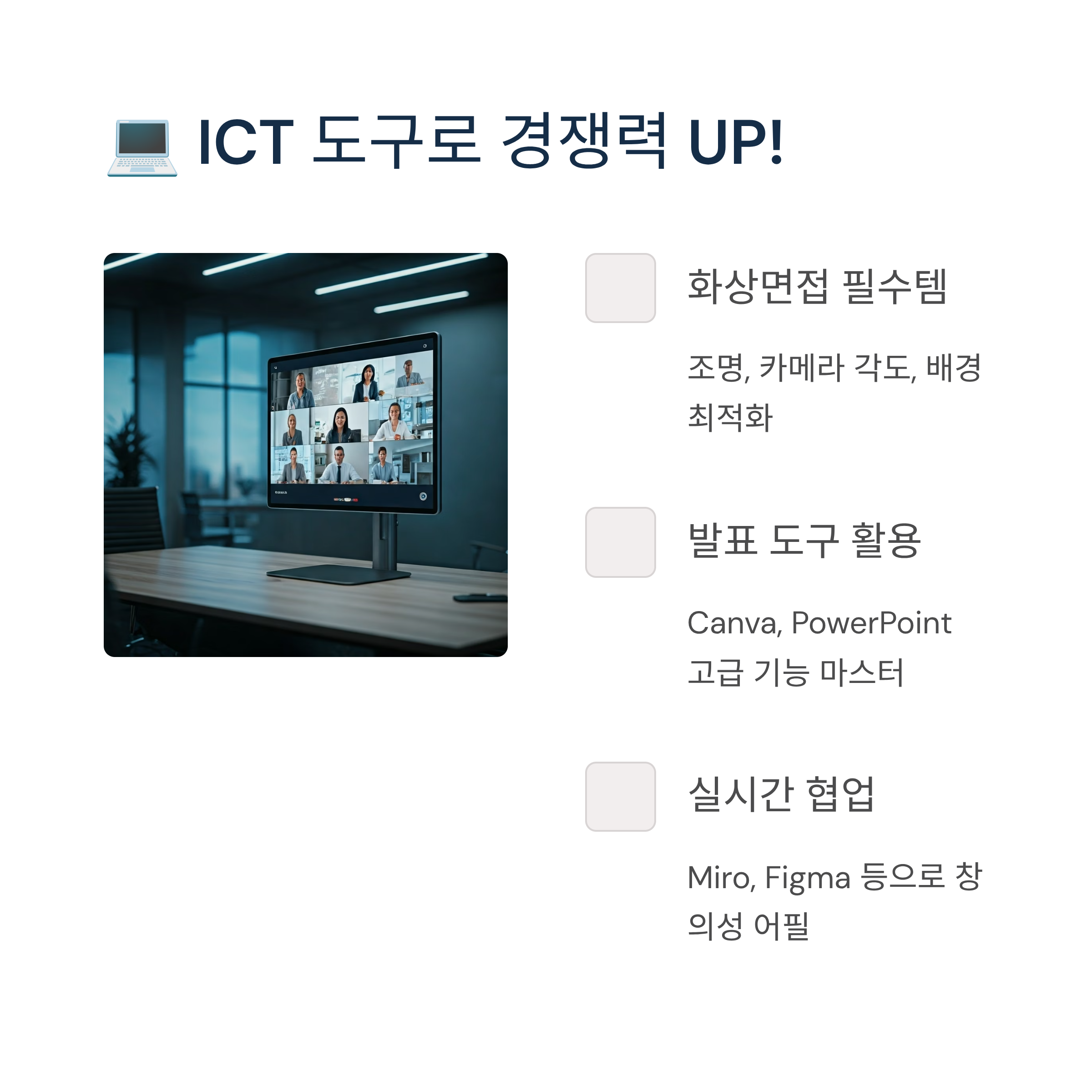 | ICT 도구 | AI 면접 앱, 녹화/녹음 앱, 온라인 플랫폼, 협업 도구 | 맞춤형 훈련, 자기 분석, 자료 공유, 비대면 연습 |