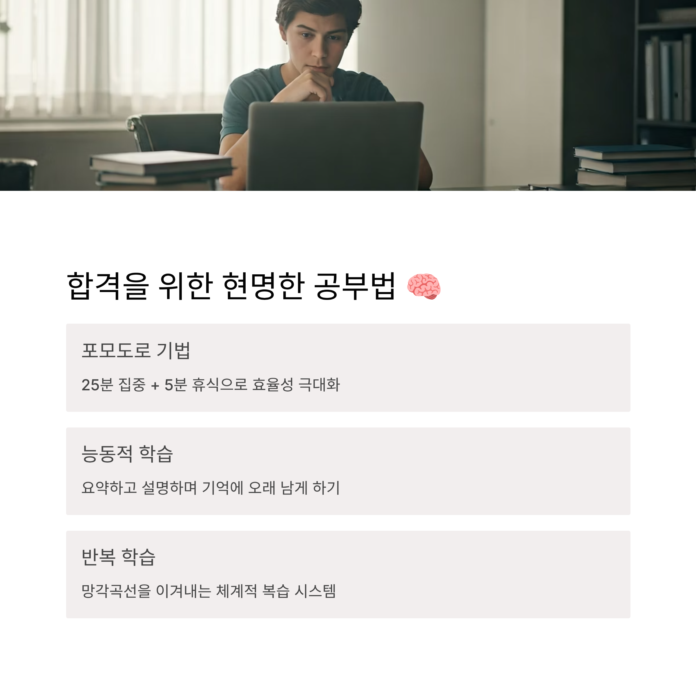 - 25분 집중 학습 후 5분 휴식, 4세트 후 30분 휴식과 같은 뽀모도로 기법을 활용하여 집중력을 높이고 지루함을 줄일 수 있습니다.