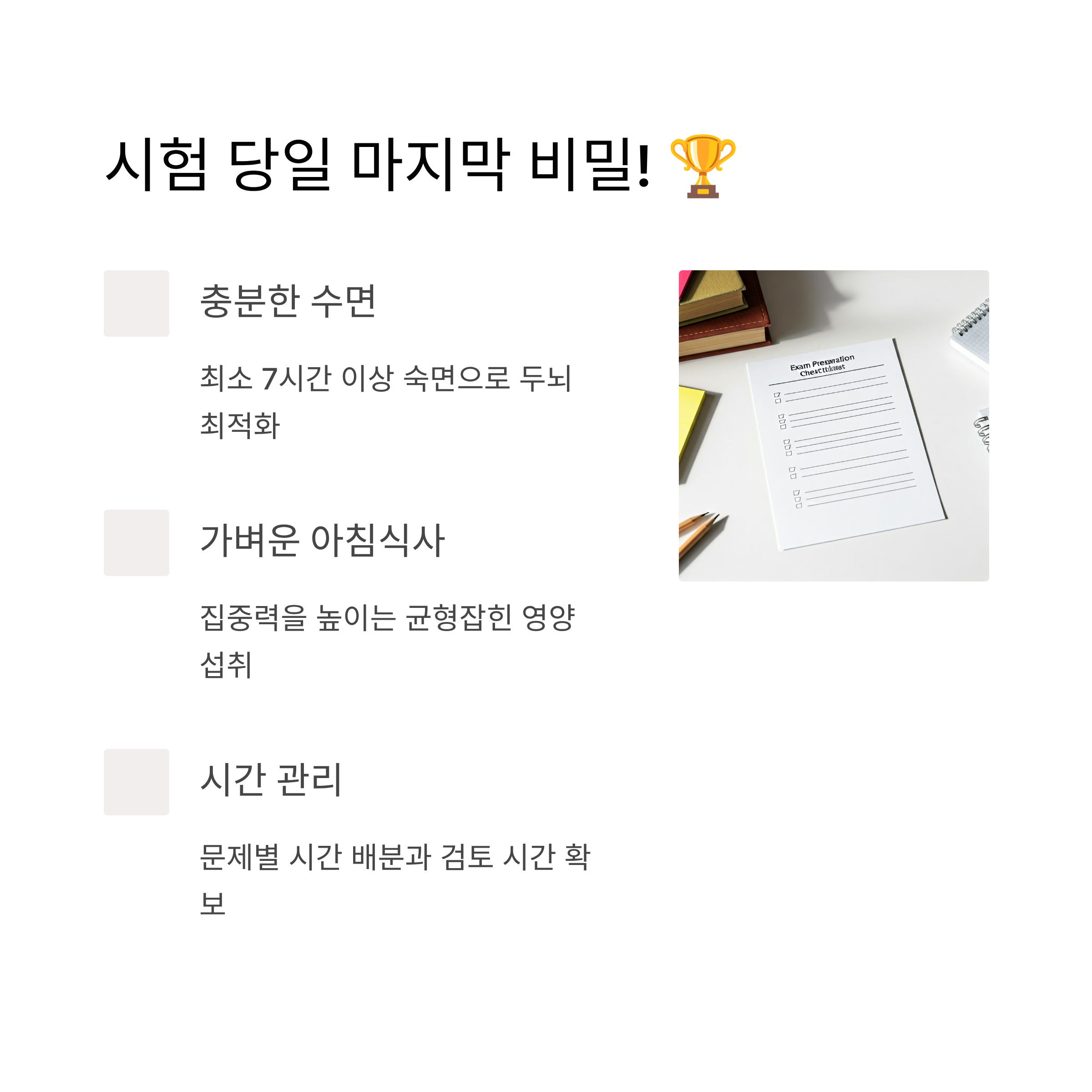 모든 준비가 끝났다면, 시험 당일 '마지막 비밀'을 활용하여 최고의 컨디션으로 실력을 발휘해야 합니다.