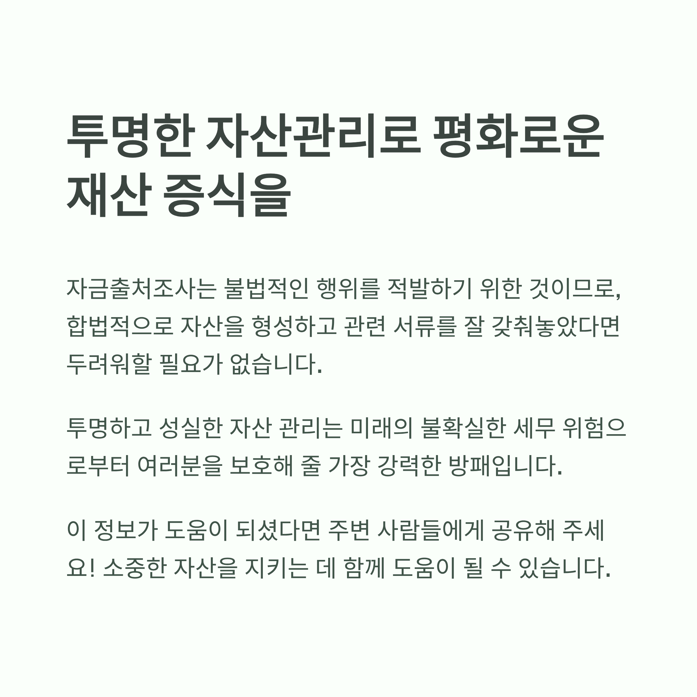 투명하고 성실한 자산 관리는 미래의 불확실한 세무 위험으로부터 여러분을 보호해 줄 가장 강력한 방패입니다. ✨