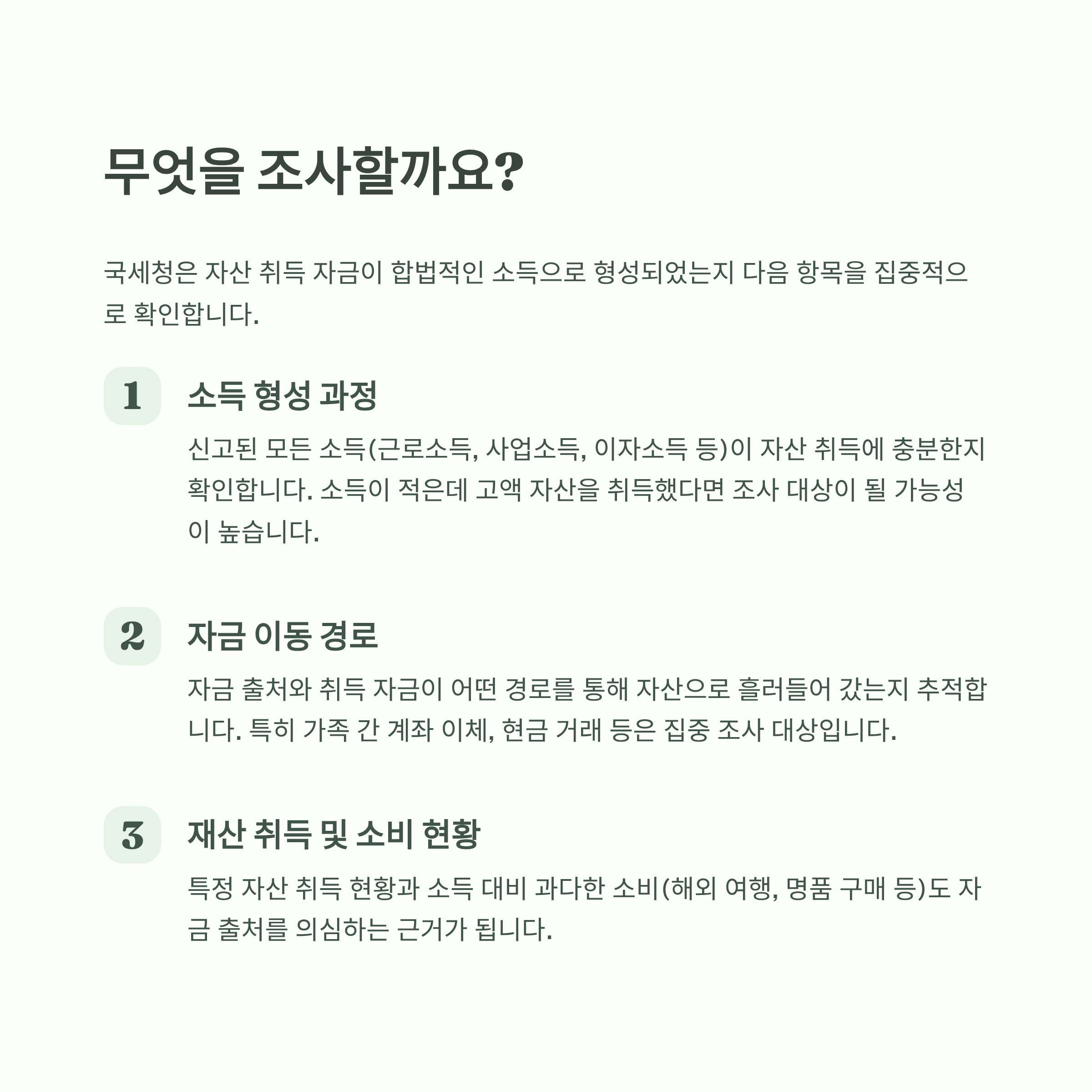 자금출처조사는 특정 자산(부동산, 주식, 예금 등)을 취득한 자금이 어디에서 왔는지, 합법적인 소득으로 형성되었는지를 국세청이 면밀하게 확인하는 과정이에요. 주로 다음 세 가지를 집중적으로 들여다봅니다.