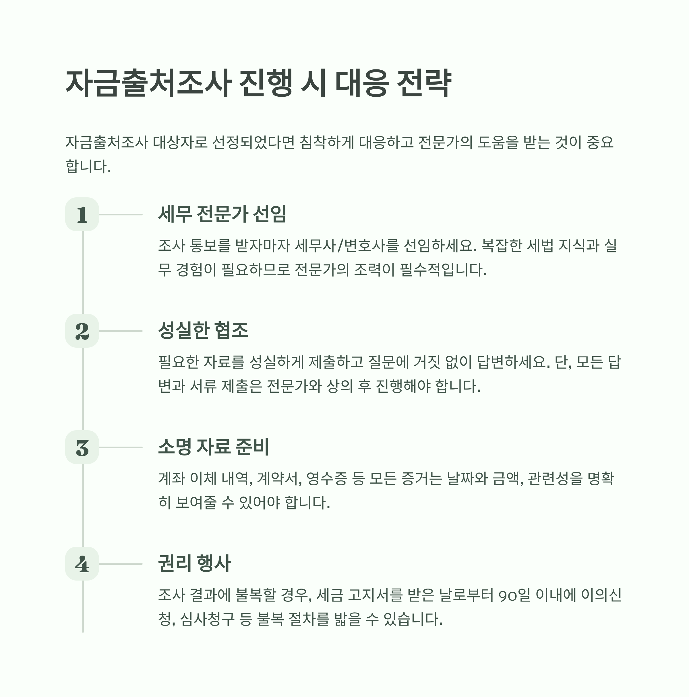 자금출처조사는 전문가의 도움이 가장 절실한 상황입니다. 혼자 해결하려 하지 말고 반드시 전문 세무사와 함께 대응하세요. 🚨