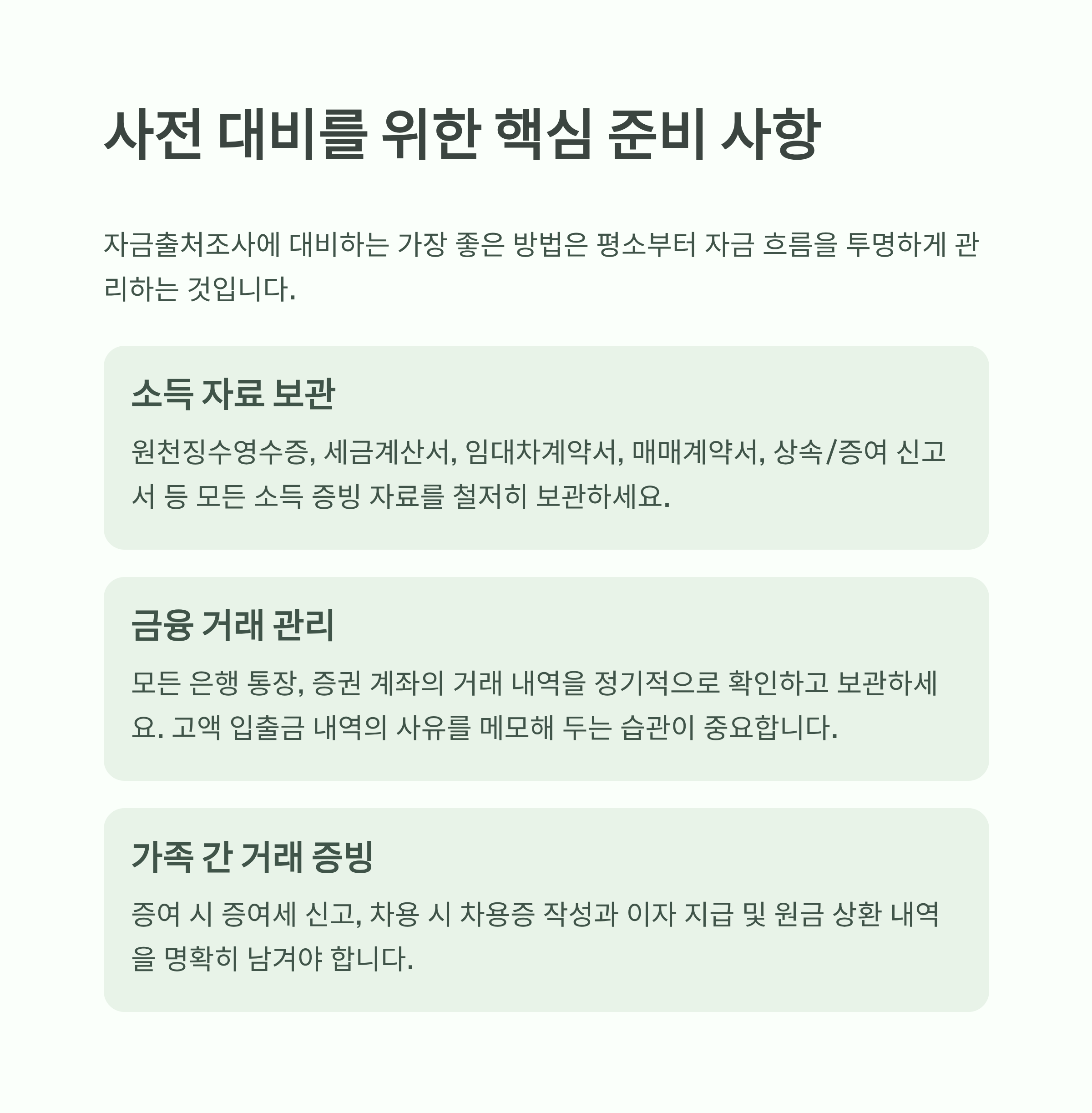 자금출처조사에 대비하는 가장 좋은 방법은 '미리 준비'하는 거예요. 평소부터 자금 흐름을 투명하게 관리하고 관련 서류를 잘 정리해 두면, 조사 시 당황하지 않고 효과적으로 소명할 수 있습니다.