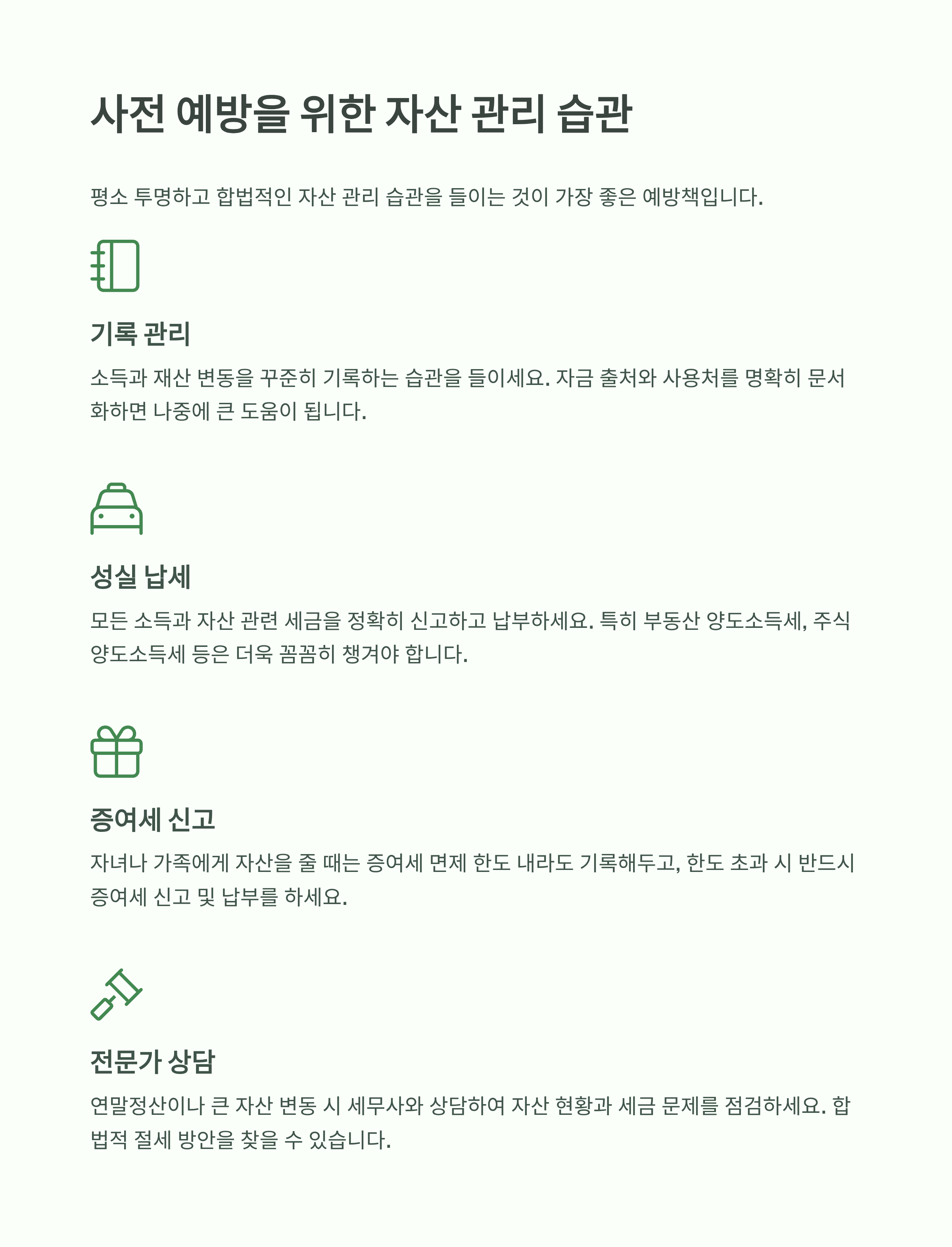 | 기록 관리 | 소득, 자산 변동, 고액 거래 내역 꾸준히 기록 | 조사 시 자료 준비 용이, 소명 능력 강화 |