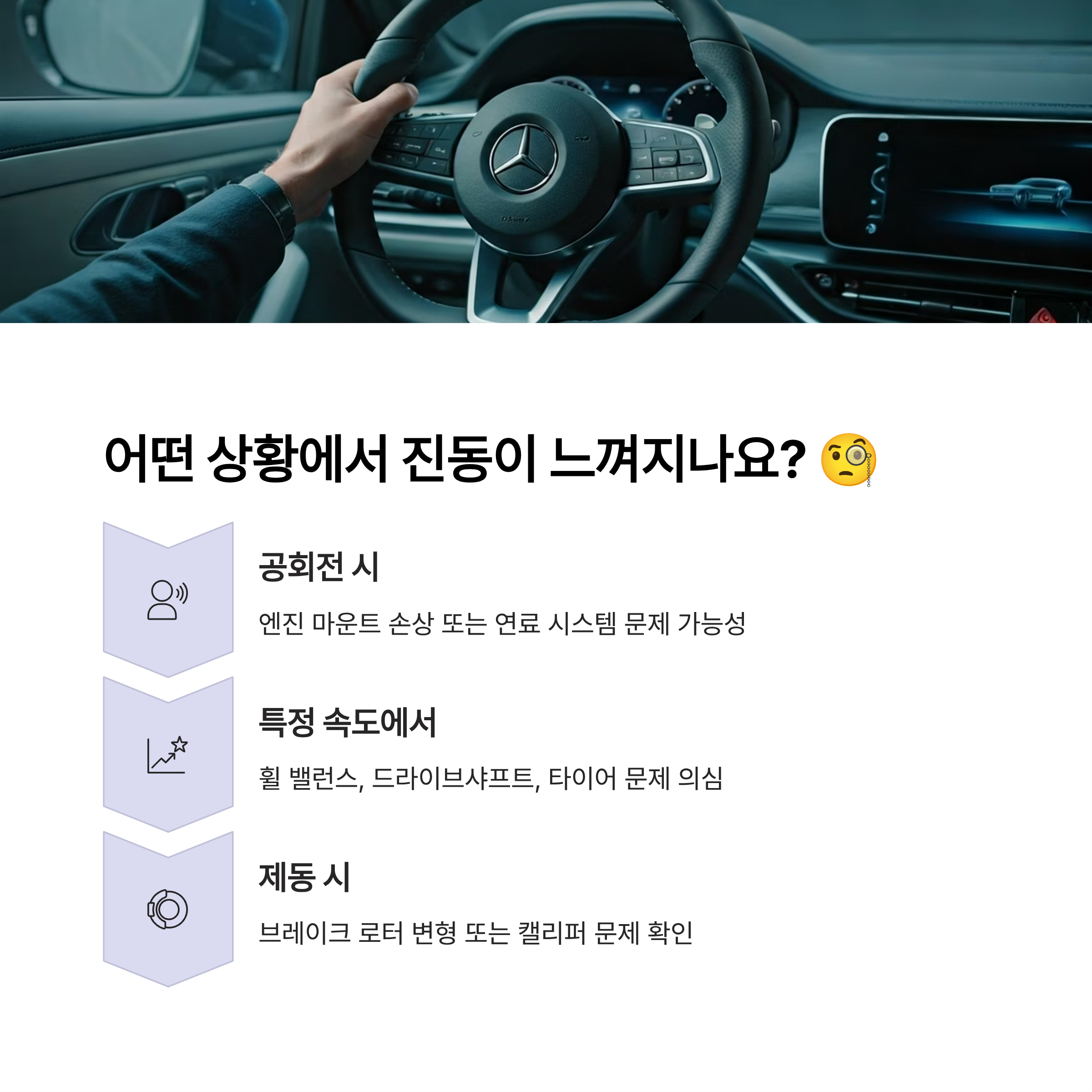 진동이 언제, 어디서, 어떻게 느껴지는지에 따라 원인을 어느 정도 추정해 볼 수 있어요. 운전 중 진동이 느껴진다면 다음 질문들을 통해 자가 진단을 시도해 보세요.