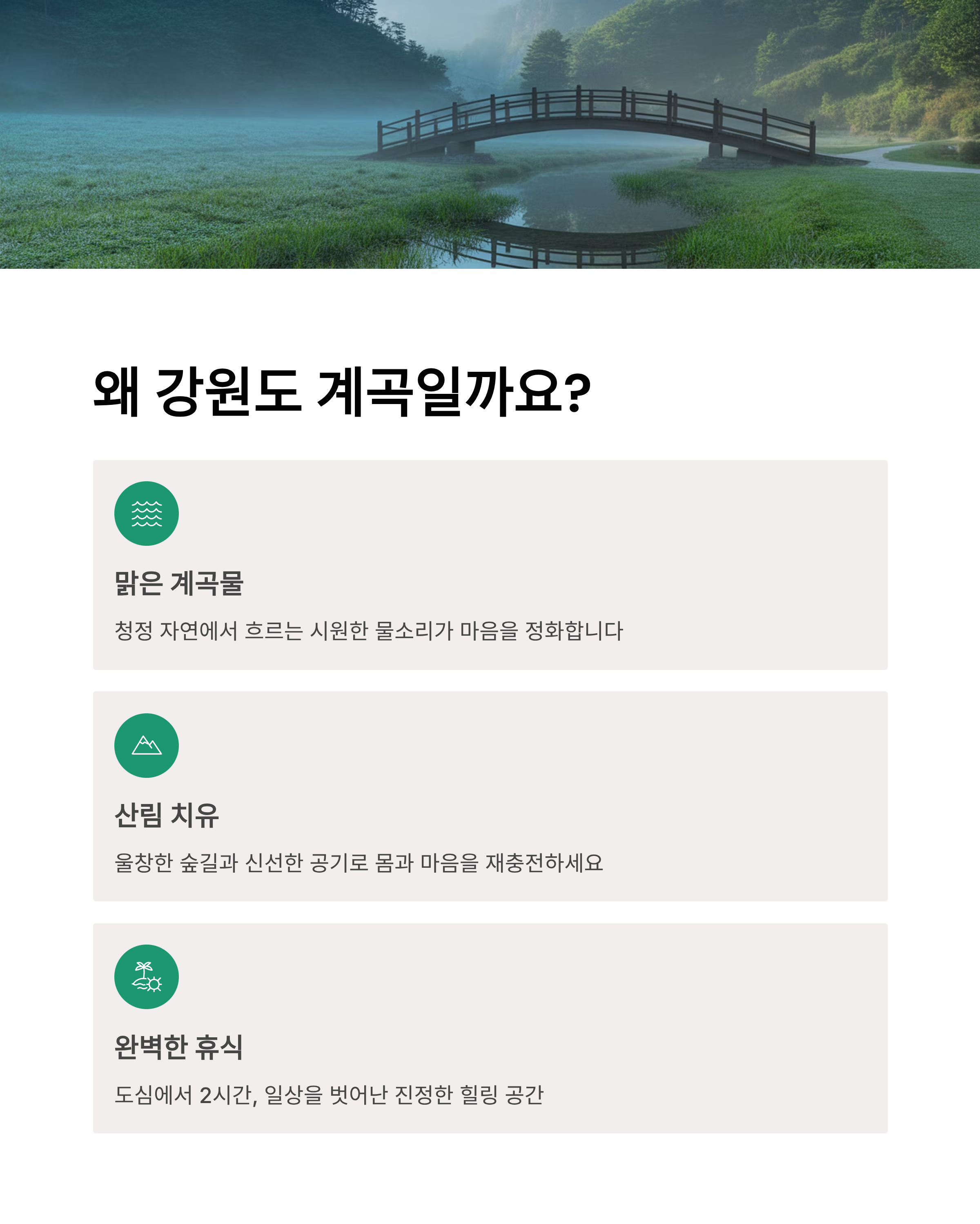 | 여행 테마 | 자연 속 힐링, 스트레스 해소, 재충전, 신체 활력 증진 | 맑은 공기, 계곡물 소리, 피톤치드 가득한 자연 만끽 |